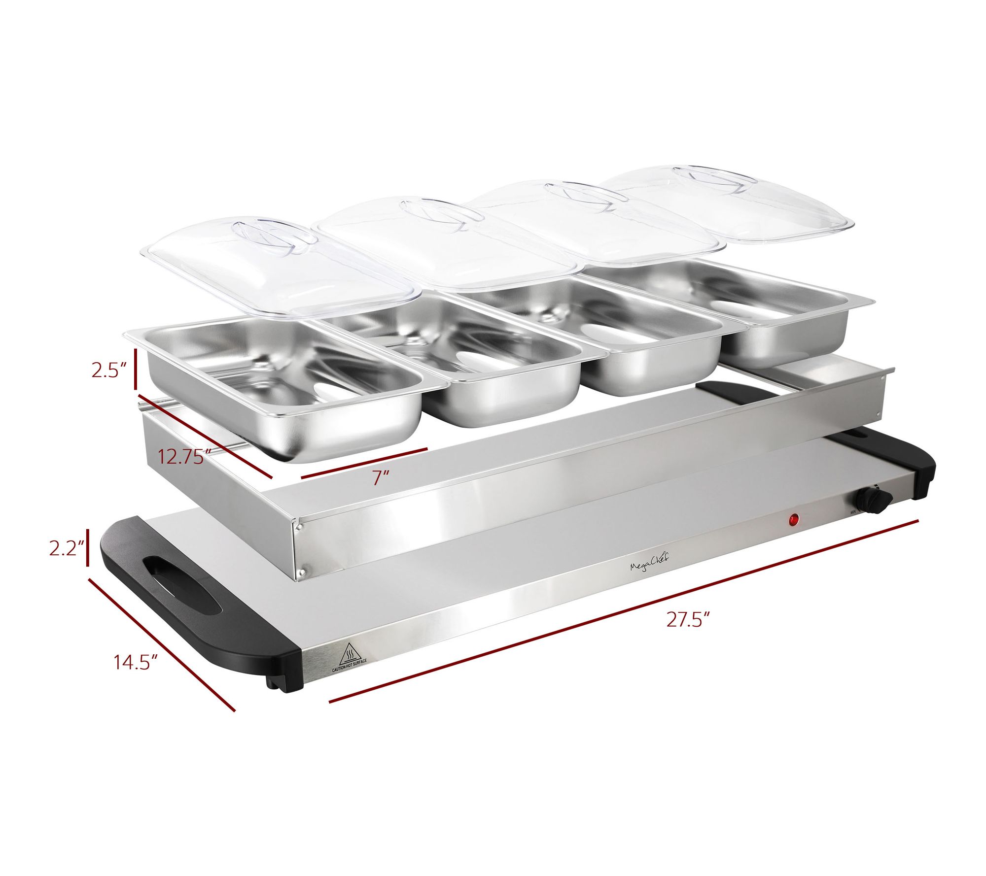 • Approximate measurements: Heating base tray 2.2"H x 14.5"W x 25.5"L; Warming surface 14"W x 20.75"L; Tray frame 20.75"L x 14.75"W