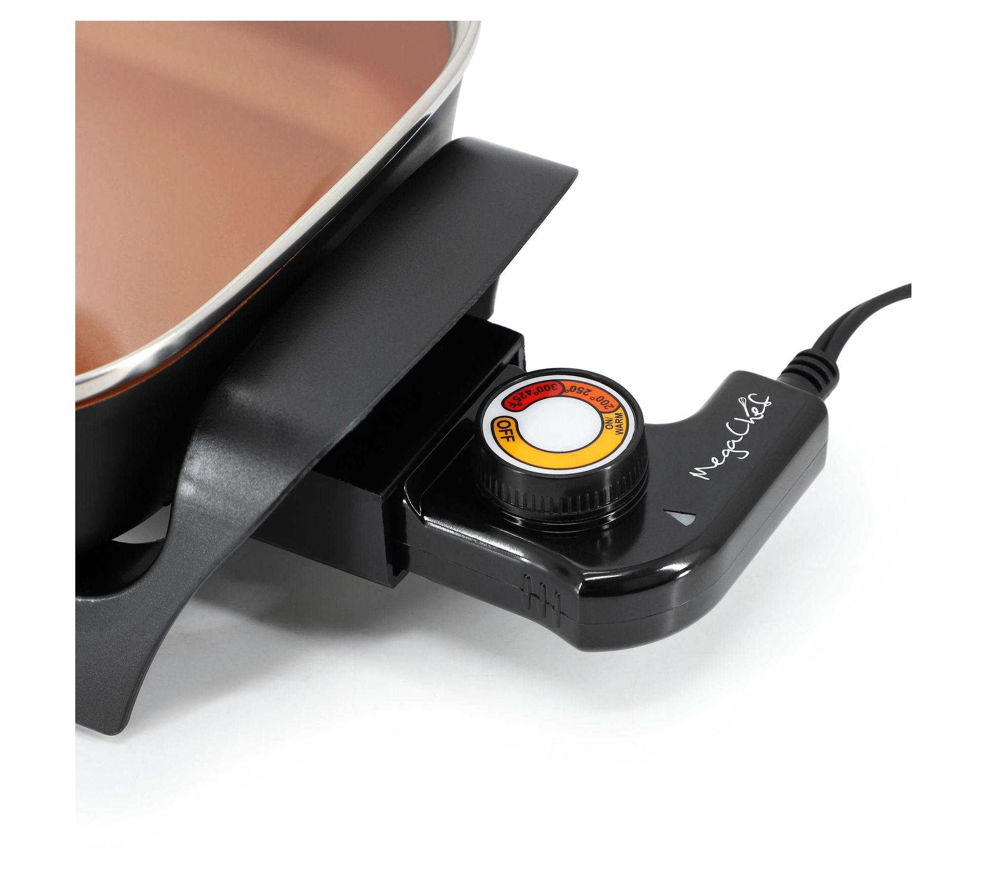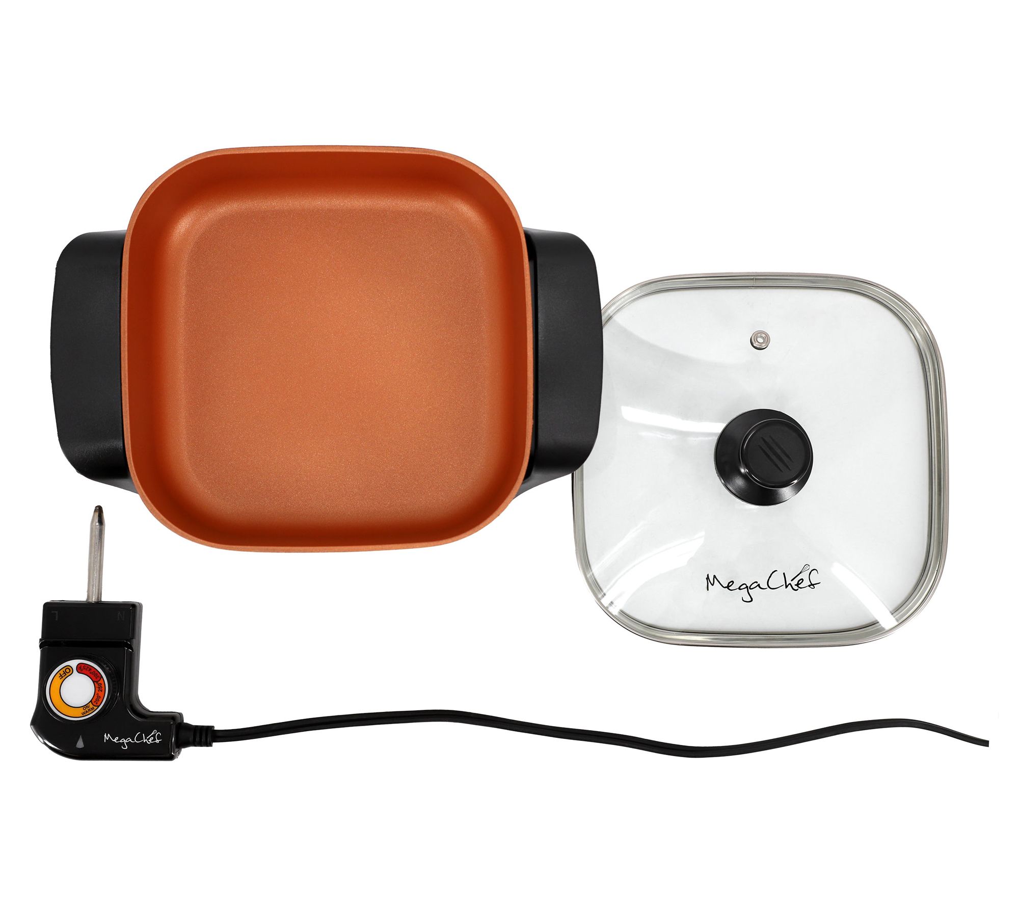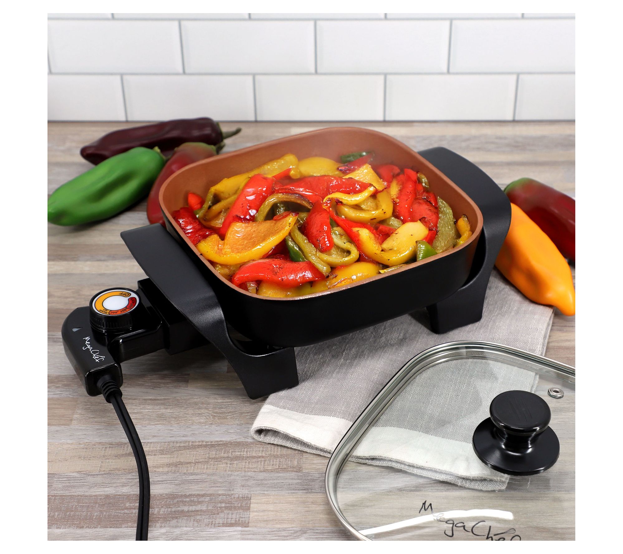 Whip up a quick breakfast or an easy dinner with this compact electric skillet. The copper-coated black pan ensures even heat distribution and a nonstick surface means cleanup is easy. With its adjustable temperature control, you can make a variety of dishes with precision. The tempered glass lid lets you see your food without losing heat while the ergonomic Bakelite handles provide a secure grip. Perfect for any meal, this skillet brings convenience and style to your cooking. From MegaChef.