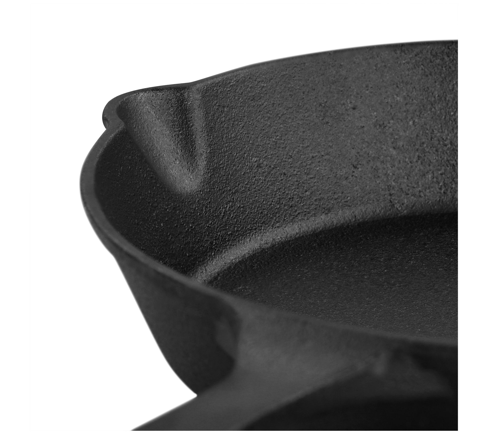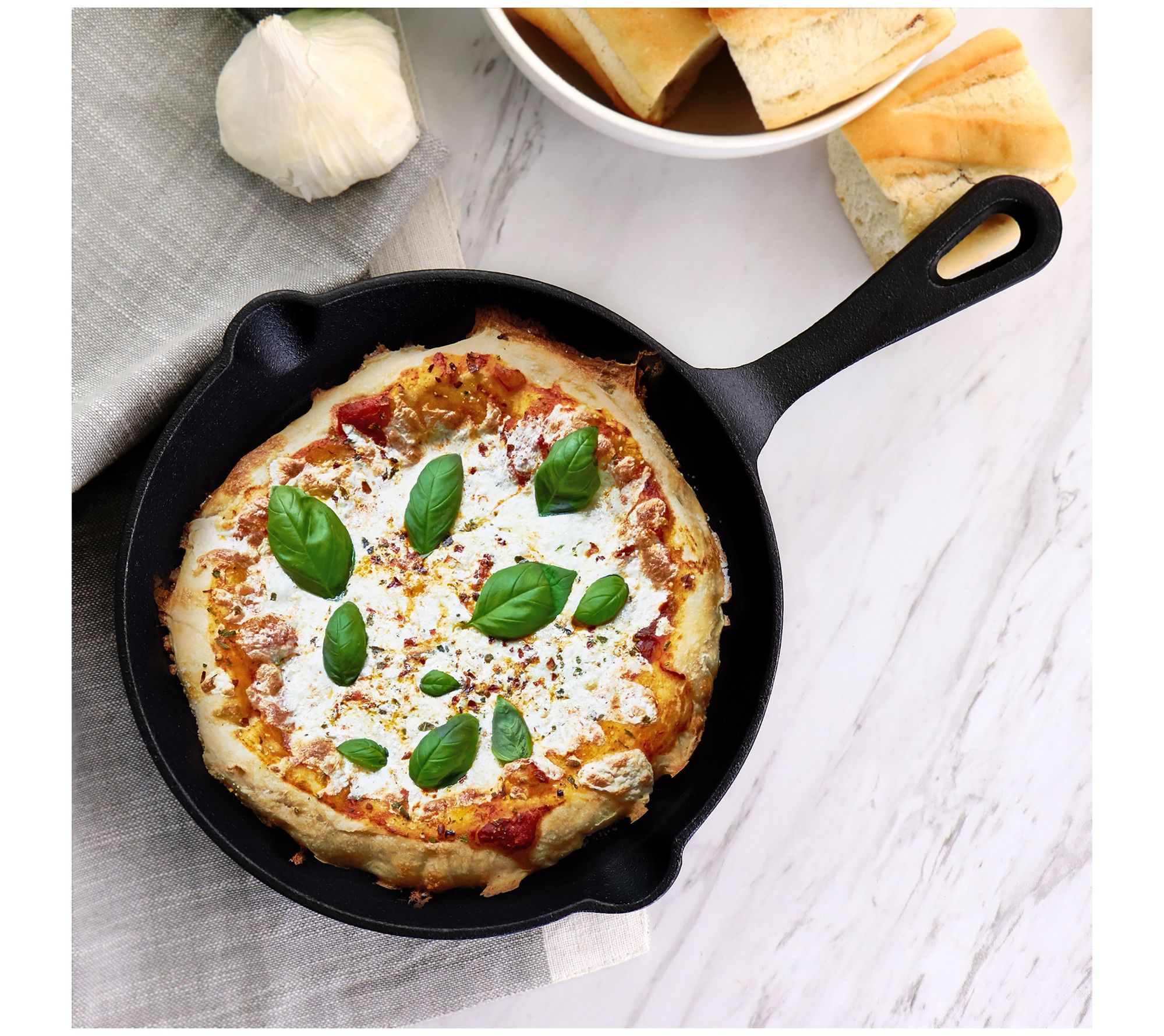 The MegaChef 8in round pre-seasoned cast iron pan is an every day essential for your cooking needs. Small 8in size is great for one to two person meals, side dish prep, reheating, and more. Versatile cast iron material is great for consistent even heating, and bringing your dish from the stove top to finish in the oven- oven safe up to 500F. Features include a hanging hole on handle that offers storage options, and pour spouts at the sides that are convenient for draining meat juices and pouring sauces. Preseasoned coating prevents rust while sitting in storage and means you can get to cooking right away!;One Frying Pan