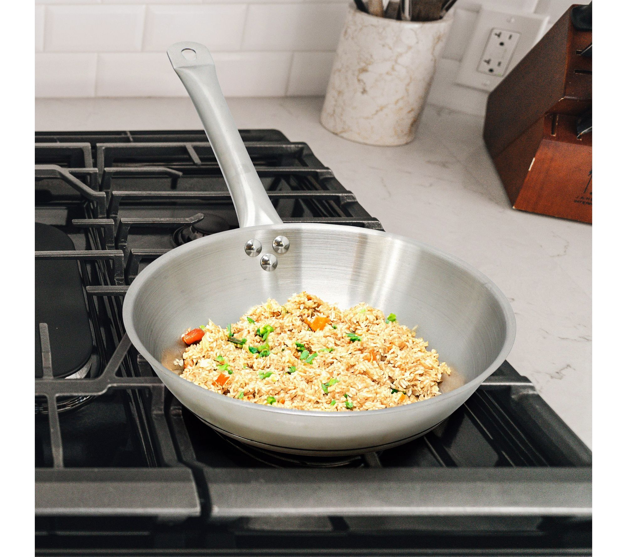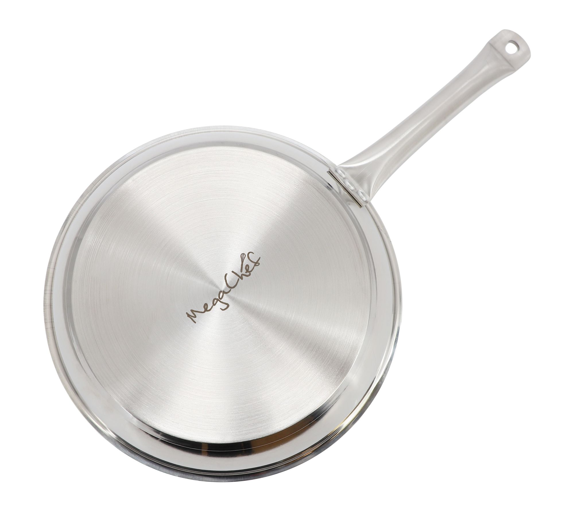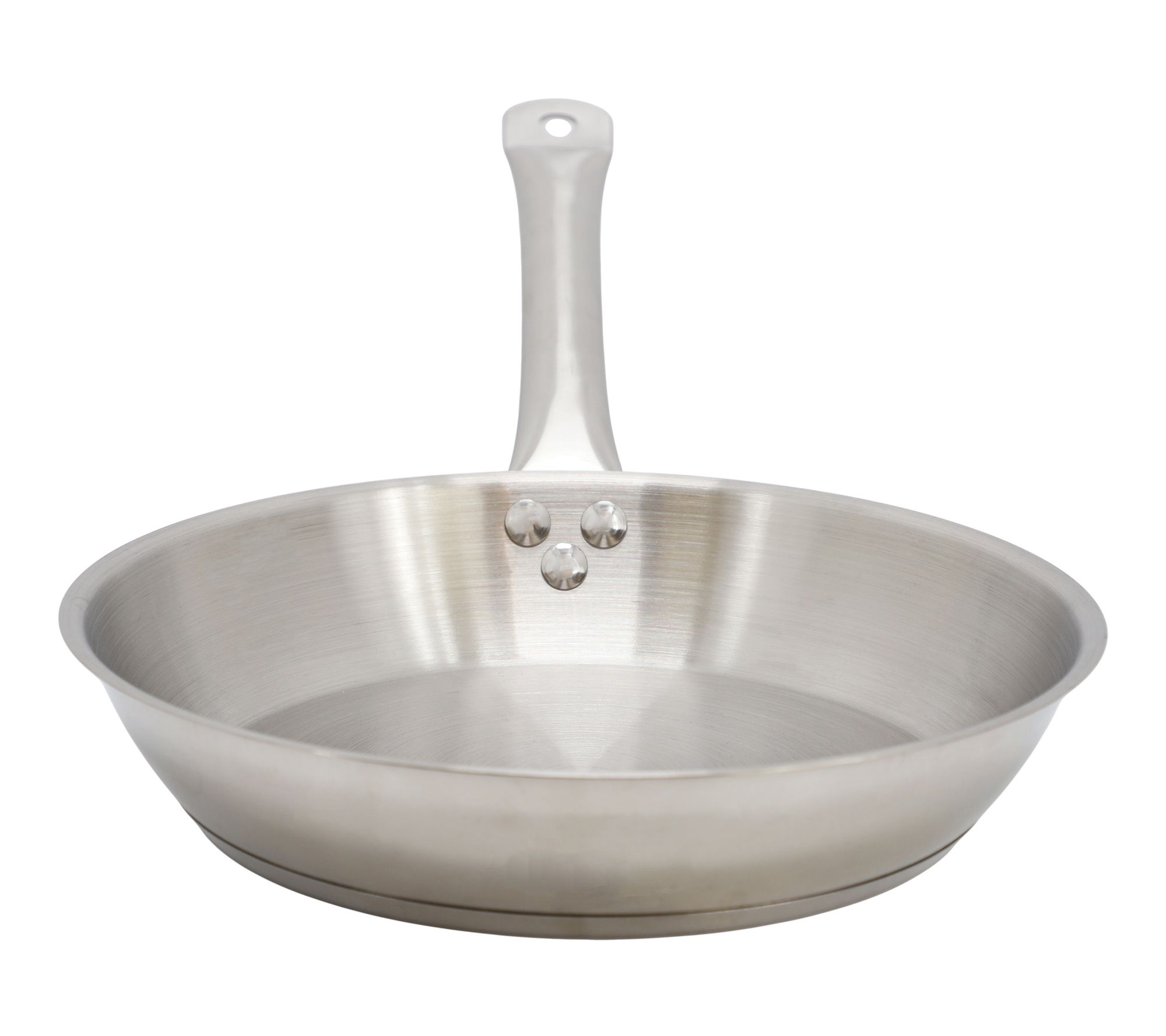 Whether you're whipping up a quick breakfast scramble or searing savory veggies for dinner, this 10" fry pan makes every meal feel effortless. The stainless steel construction ensures even heat distribution, while the triple-riveted handle offers a secure grip for confident cooking. With a polished finish and convenient hanging hole, it's a stylish and practical addition to any kitchen. From MegaChef.