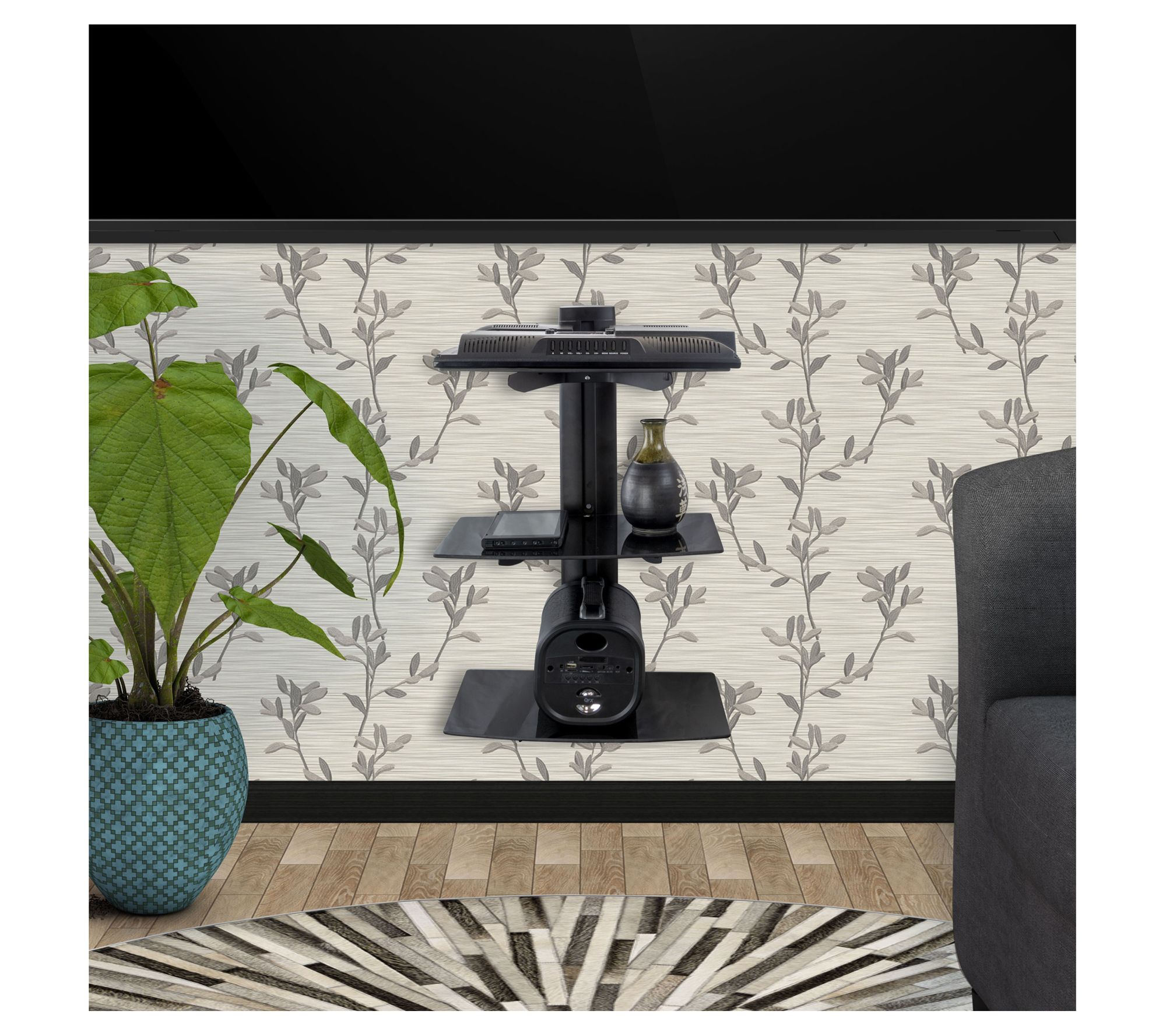 Get more up off the floor. The MegaMounts three-shelf multimedia wall mount gives your game console, soundbar, Blu-ray player, and more an elevated home right there with your wall-mounted TV. Each sleek, tempered glass shelf holds up to 22 lbs. From MegaMounts.