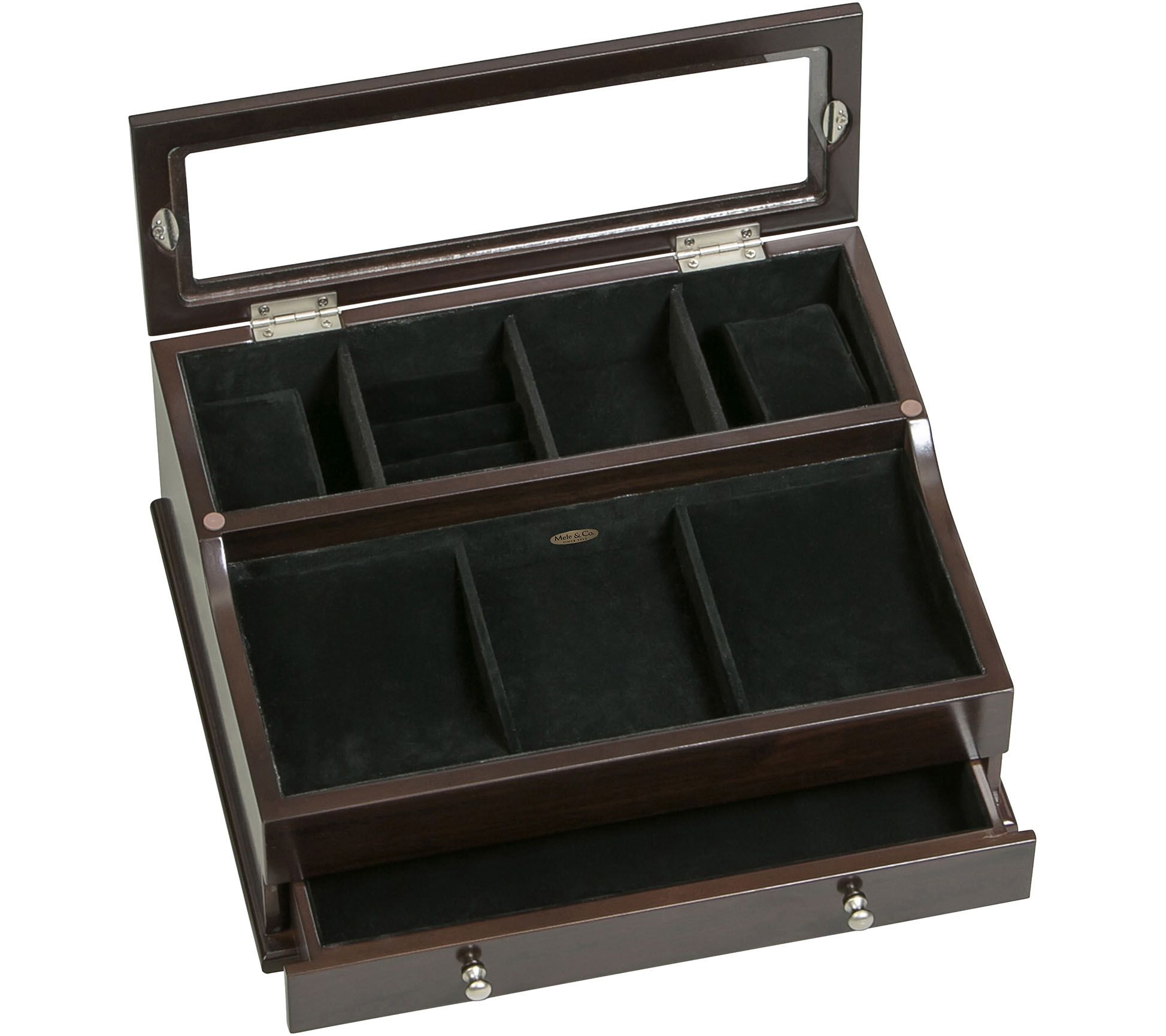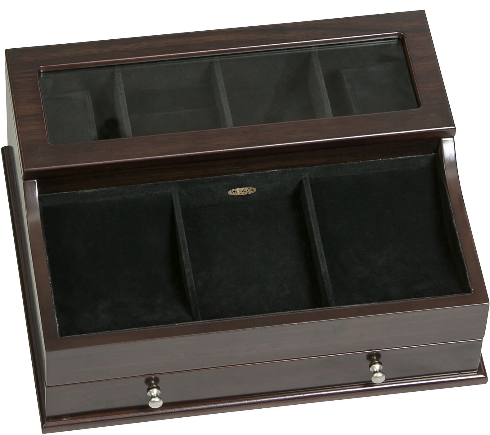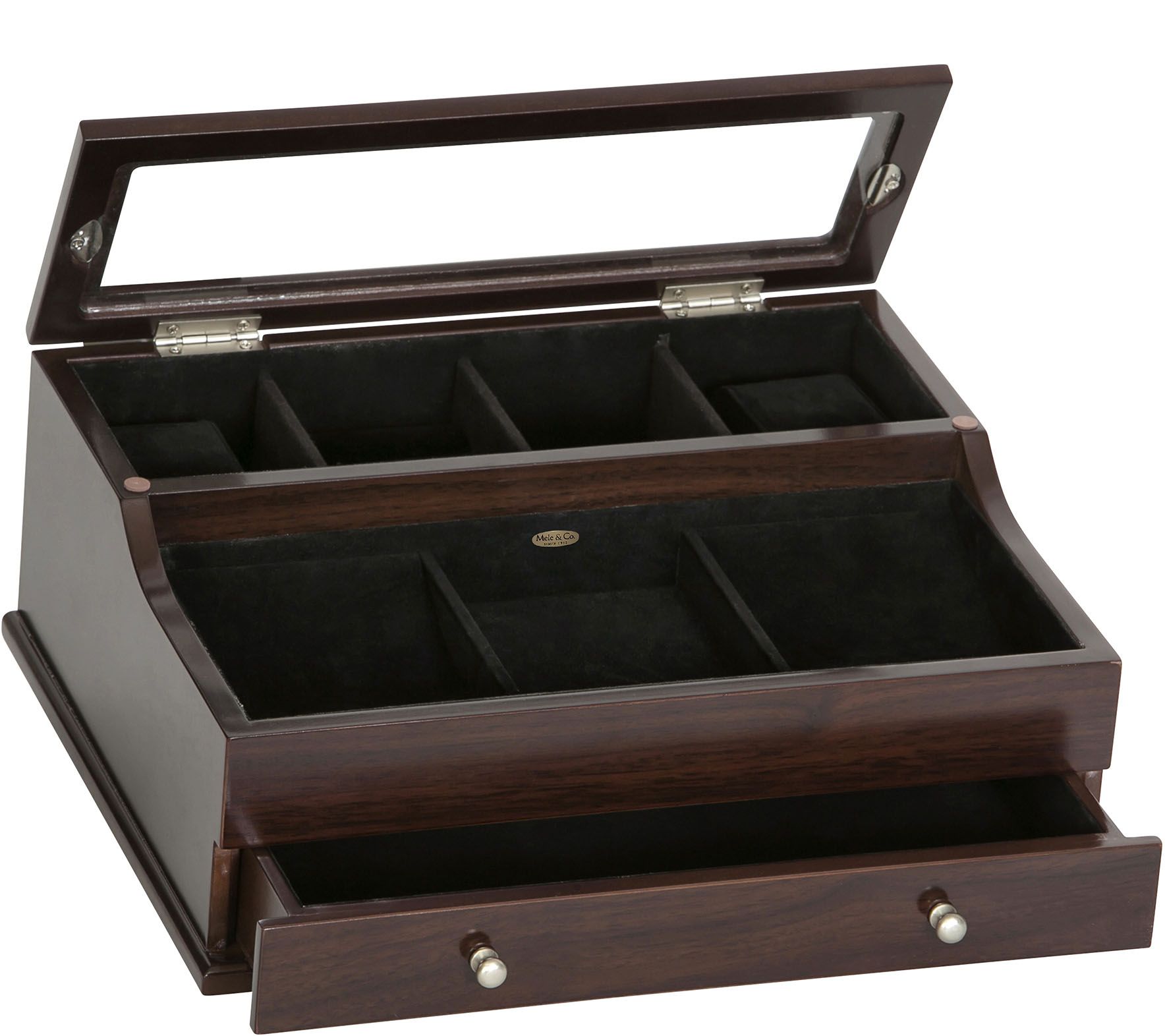• Upper tier with glass top lift lid with removable padded watch cushion, open area, and ring roll section