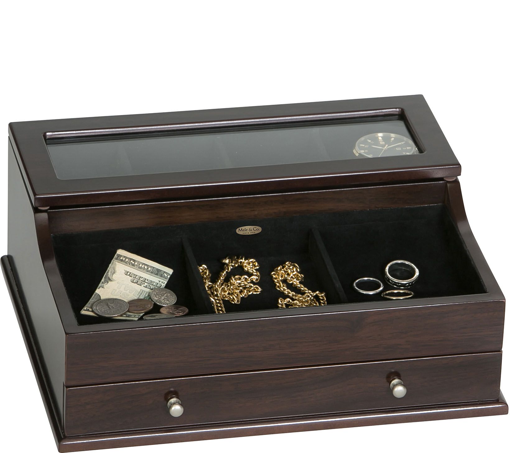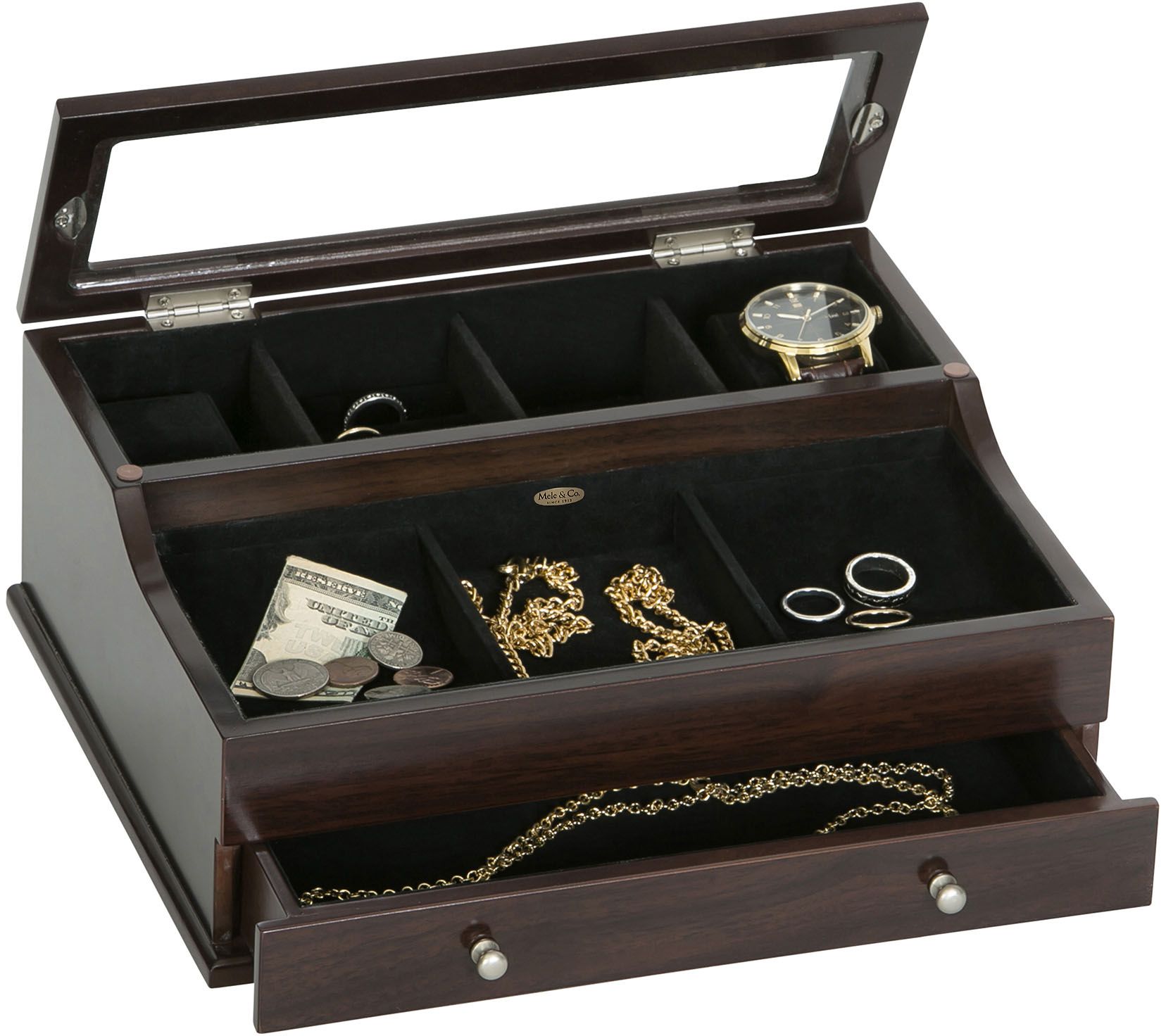 Mele & Co. Hampden Men's Glass Top Valet in Mahogany Finish