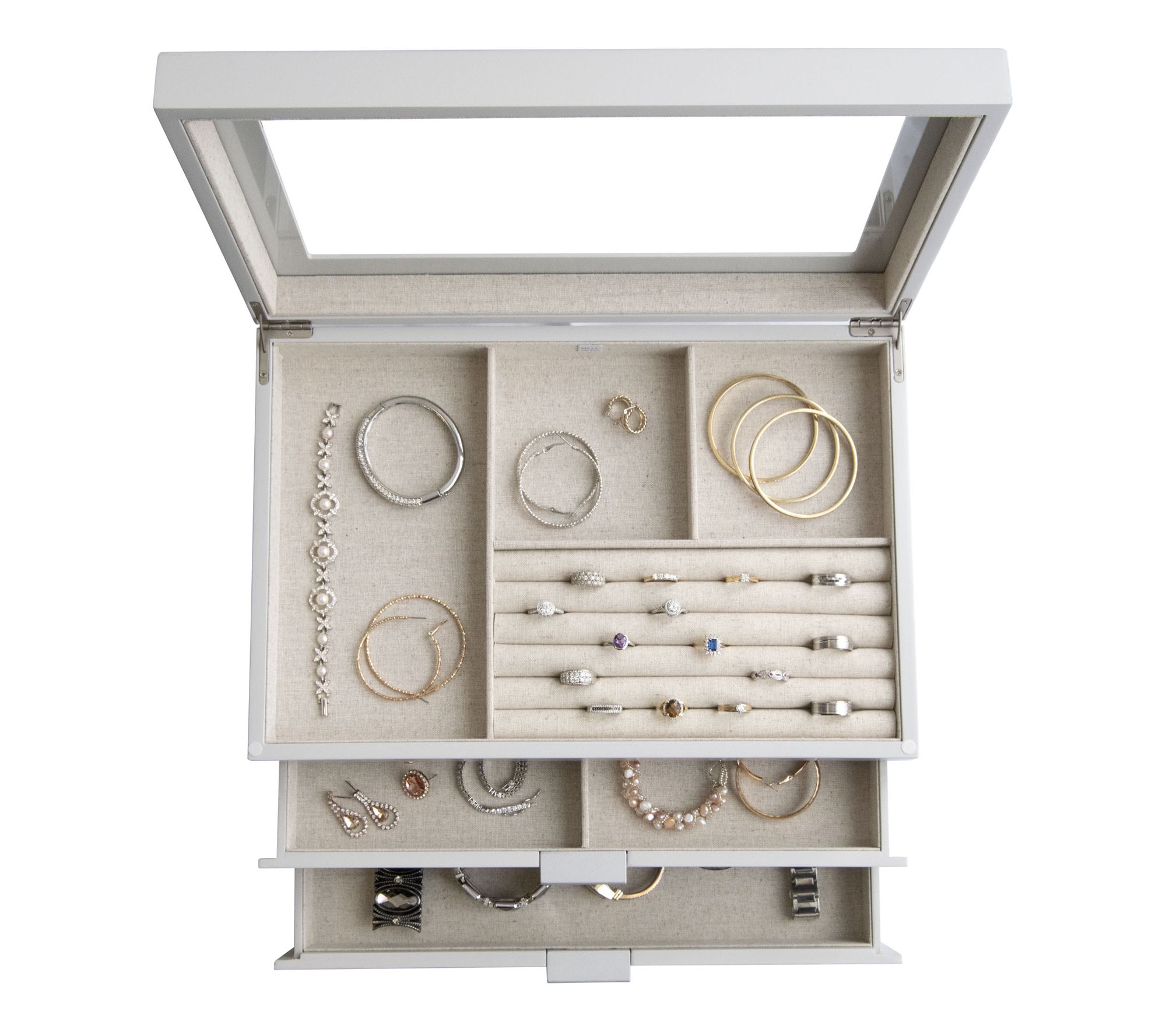 An elegantly modern organizer, this glass topped wooden jewelry box lets you take a peek inside before you reach for the perfect piece. From Mele & Co.