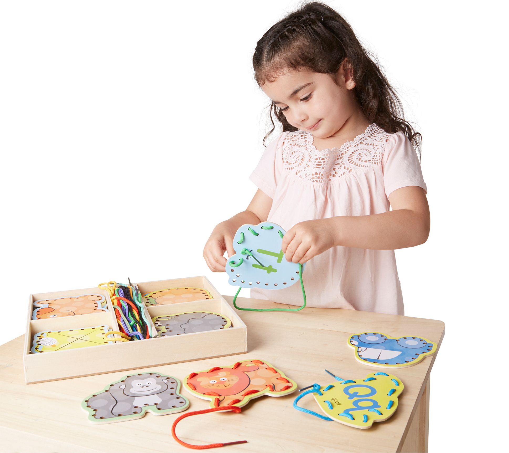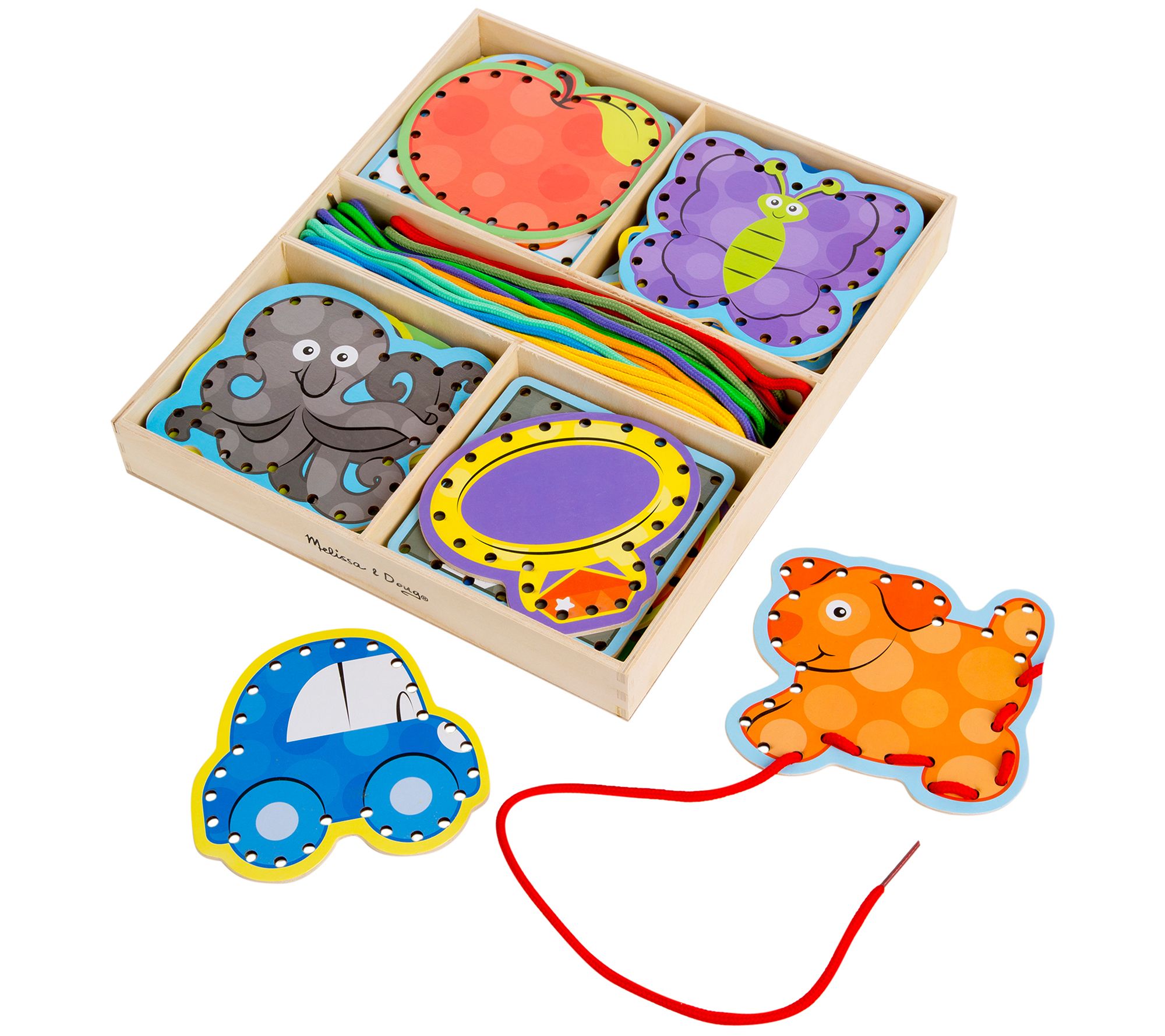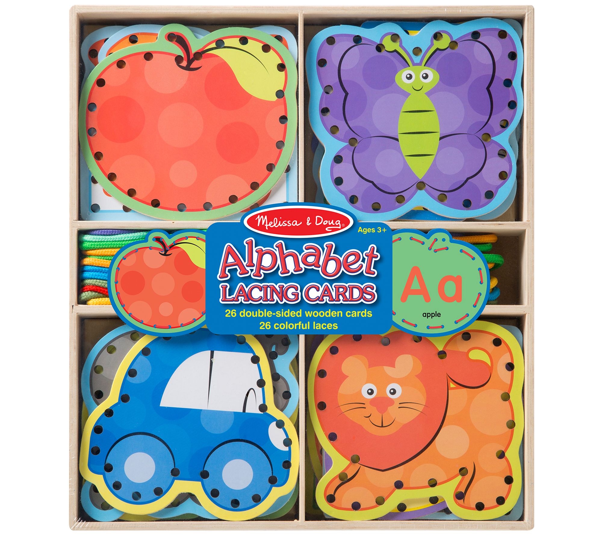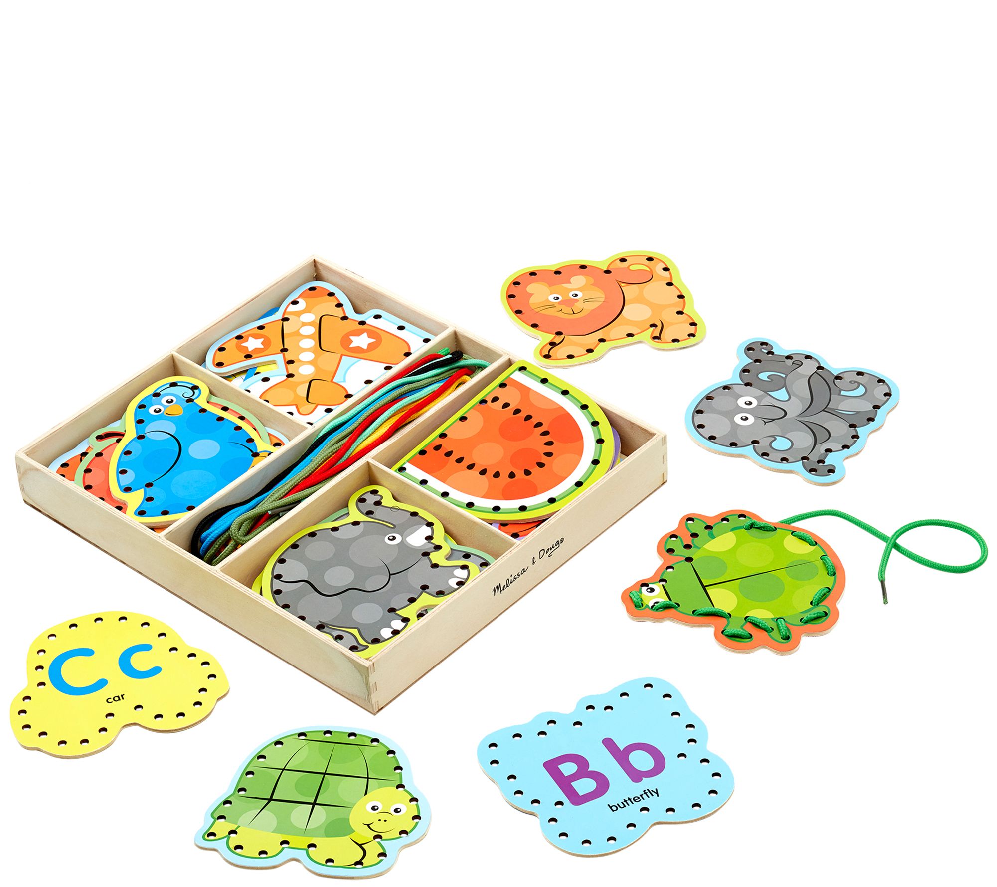 This learning set has a shaped lacing board for every letter of the alphabet, with a colorful illustration on one side and a label on the back, complete with oversized uppercase and lowercase letters. From Melissa & Doug.