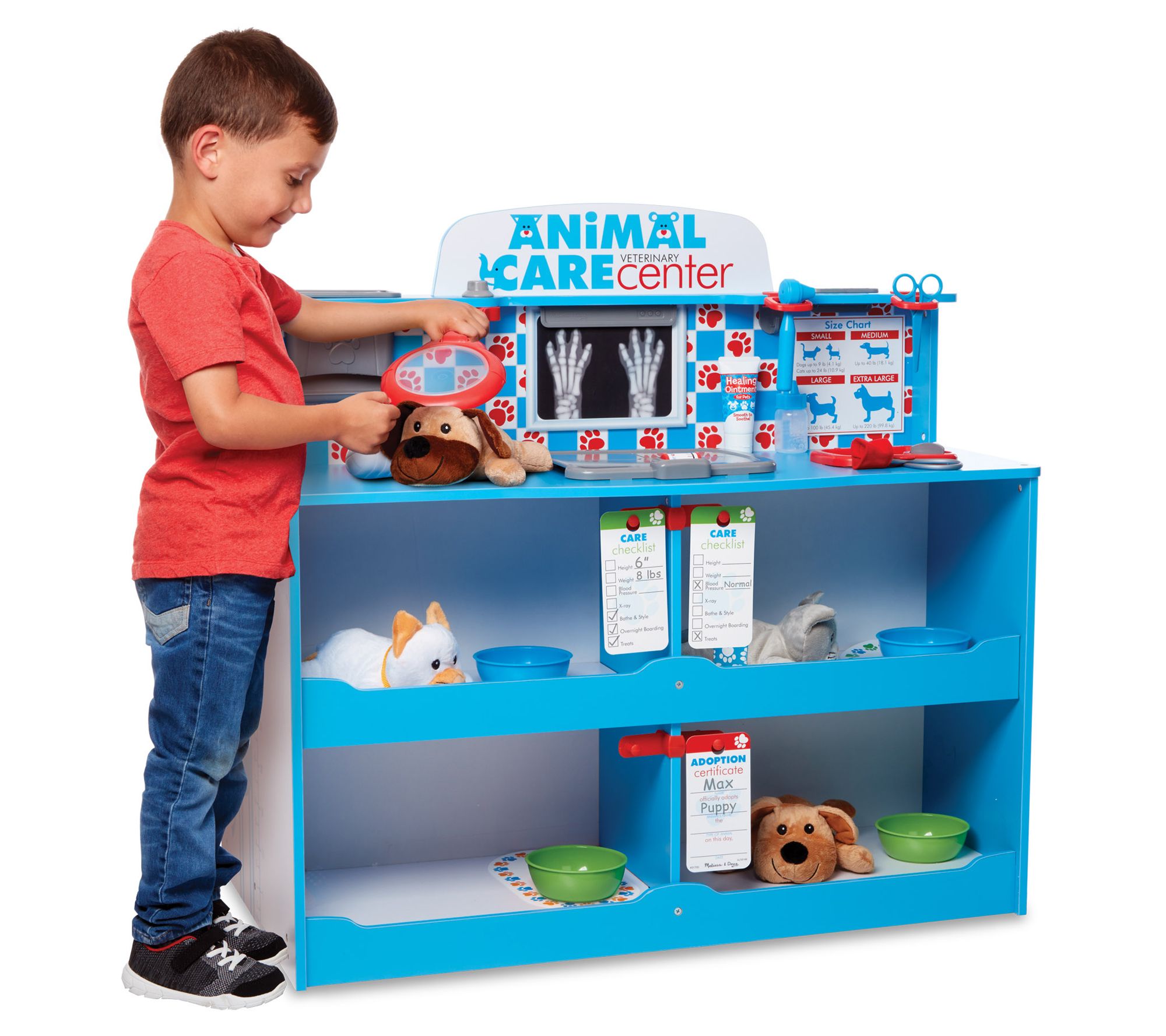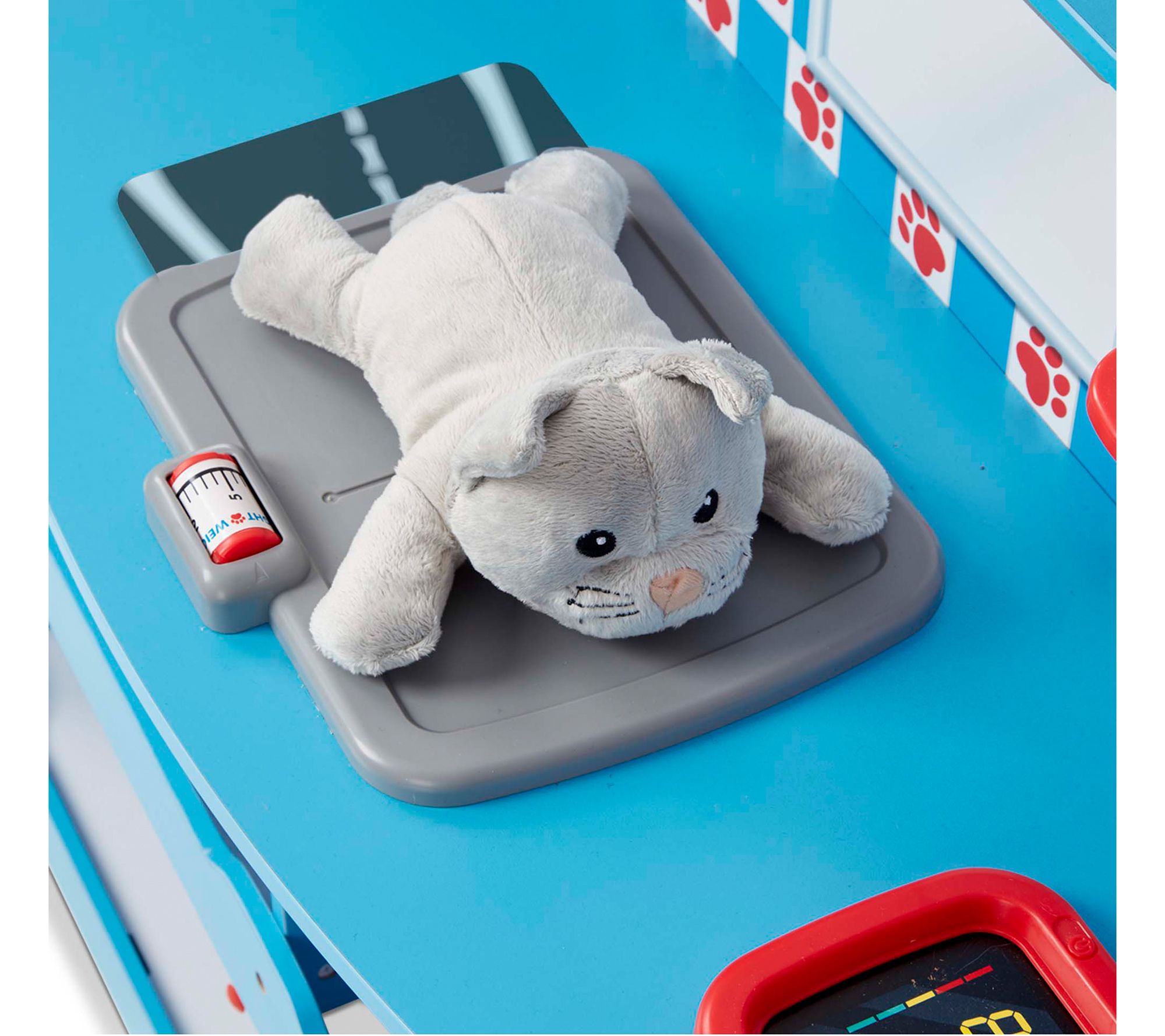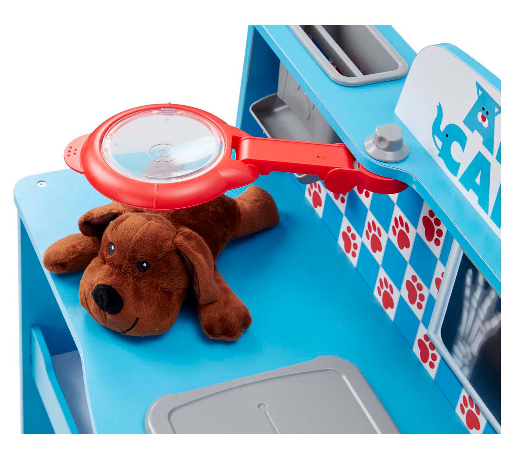 • Includes play center with x-ray lens with two removable x-rays, pet scale, blood pressure monitor, sink, treat chute, pump bottle dispenser, and storage; additional items (shown) not included
