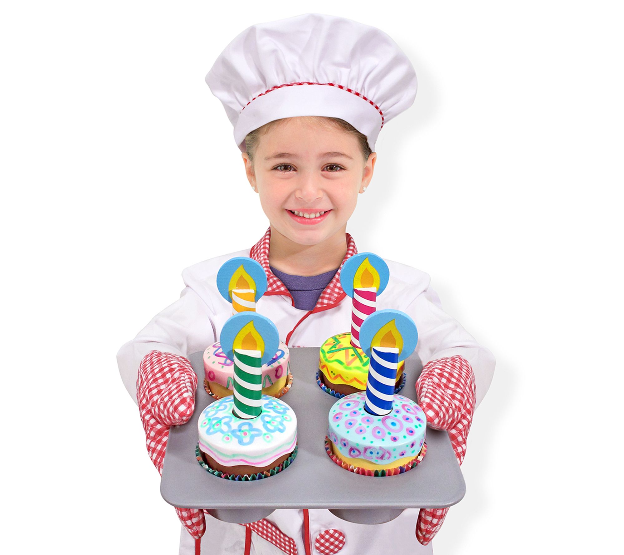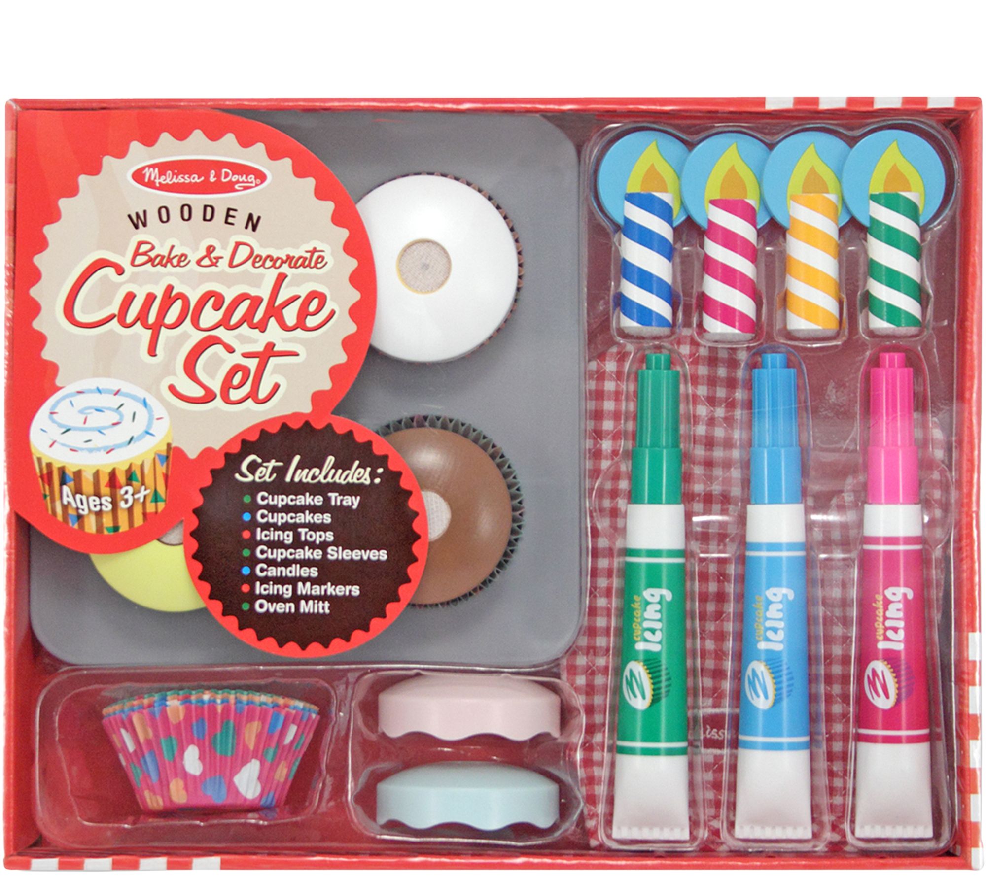• Includes four cupcakes, four cupcake tops, eight cupcake sleeves, three dry-erase markers, four candles, baking tray, and oven mitt