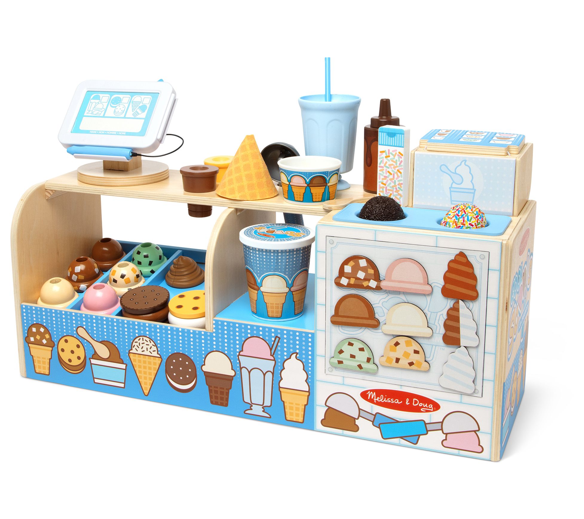• Includes wooden counter, six scoops, two 2-part soft-serve swirls, two ice cream sandwich fillings, four cookies, two toppings, two wooden cones, felt waffle cone, ice cream cup, milkshake cup, ice cream scooper, ice cream tub with lid, nine magnets, loyalty card, bank card, double-sided menu card, straw, wooden spoon, squeeze bottle, wooden sprinkles jar