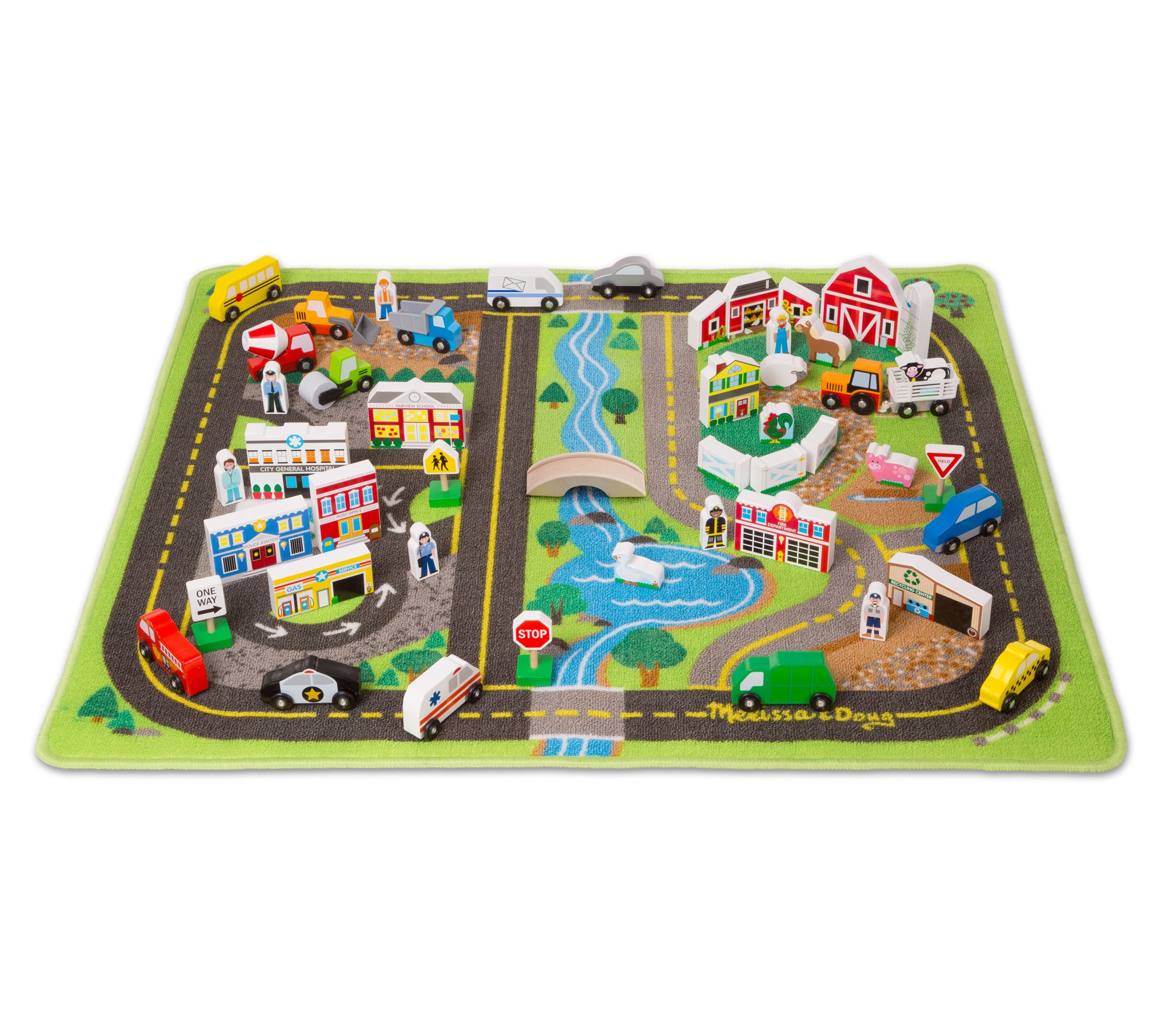 Get ready for an adventure in creativity and imagination! This deluxe road rug play set comes with a vibrant activity rug and 49 wooden play pieces so kids can set up (and play in!) their own bustling world. From Melissa & Doug.
