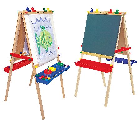 An anywhere art studio. Unfold this sturdy wooden easel and let kids get creative--indoors or out! A chalkboard, dry-erase board, and paper-roll holder provide plenty of surface area for painting, drawing, and designing. Roomy plastic storage trays collect and contain art supplies. From Melissa & Doug.