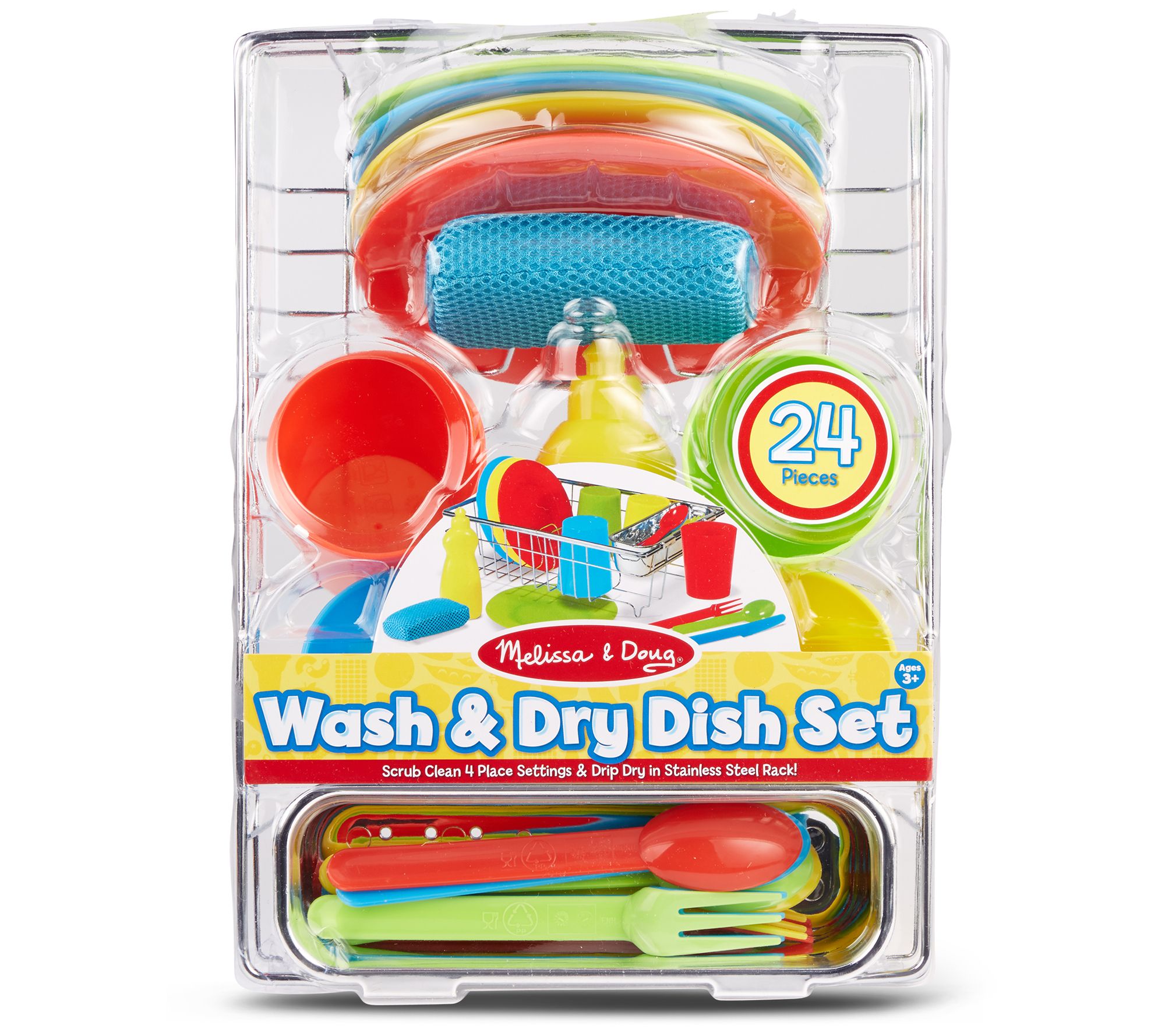 • Includes four plates, four cups, four forks, four spoons, four play knives, squeezable soap bottle, mesh-covered sponge, drying rack, and utensil insert