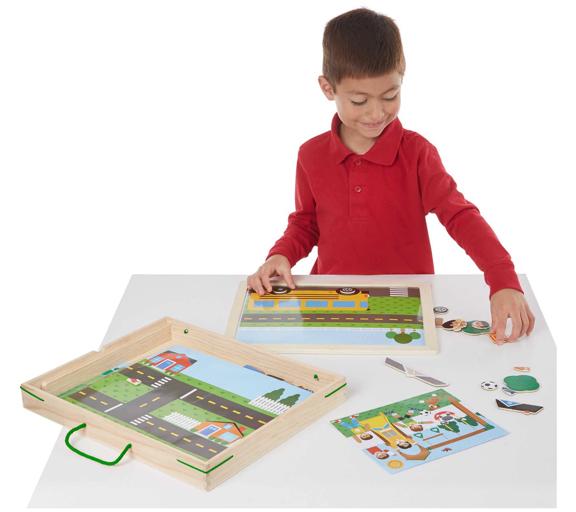 • Includes two double-sided scene cards, four double-sided suggestion picture cards, 119 wooden magnets, and wooden storage case with lid/game board