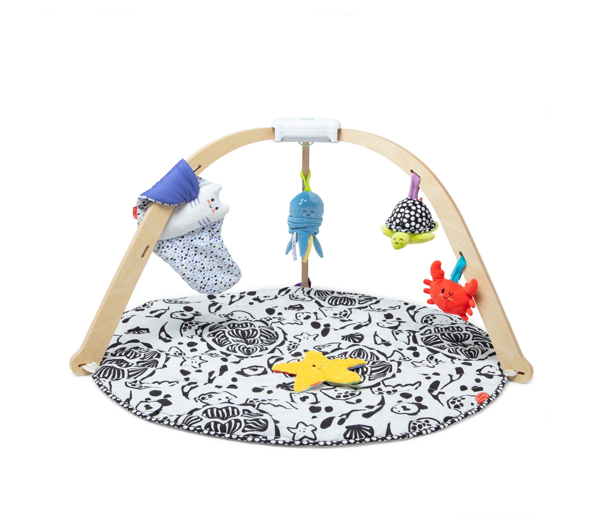 Create a playful environment for your baby with the Melissa & Doug Ocean Easy-Fold Play Gym. Designed for babies from birth to nine months, this gym features sturdy wooden arches and a comfy, reversible mat with sensory ribbons and a crinkling peek-a-boo clam shell. Engage your little one with soft, skill-supporting toys like a chiming turtle and a squeaking crab, all machine washable. Easily fold and store the gym with the Quick-Close button for convenience.