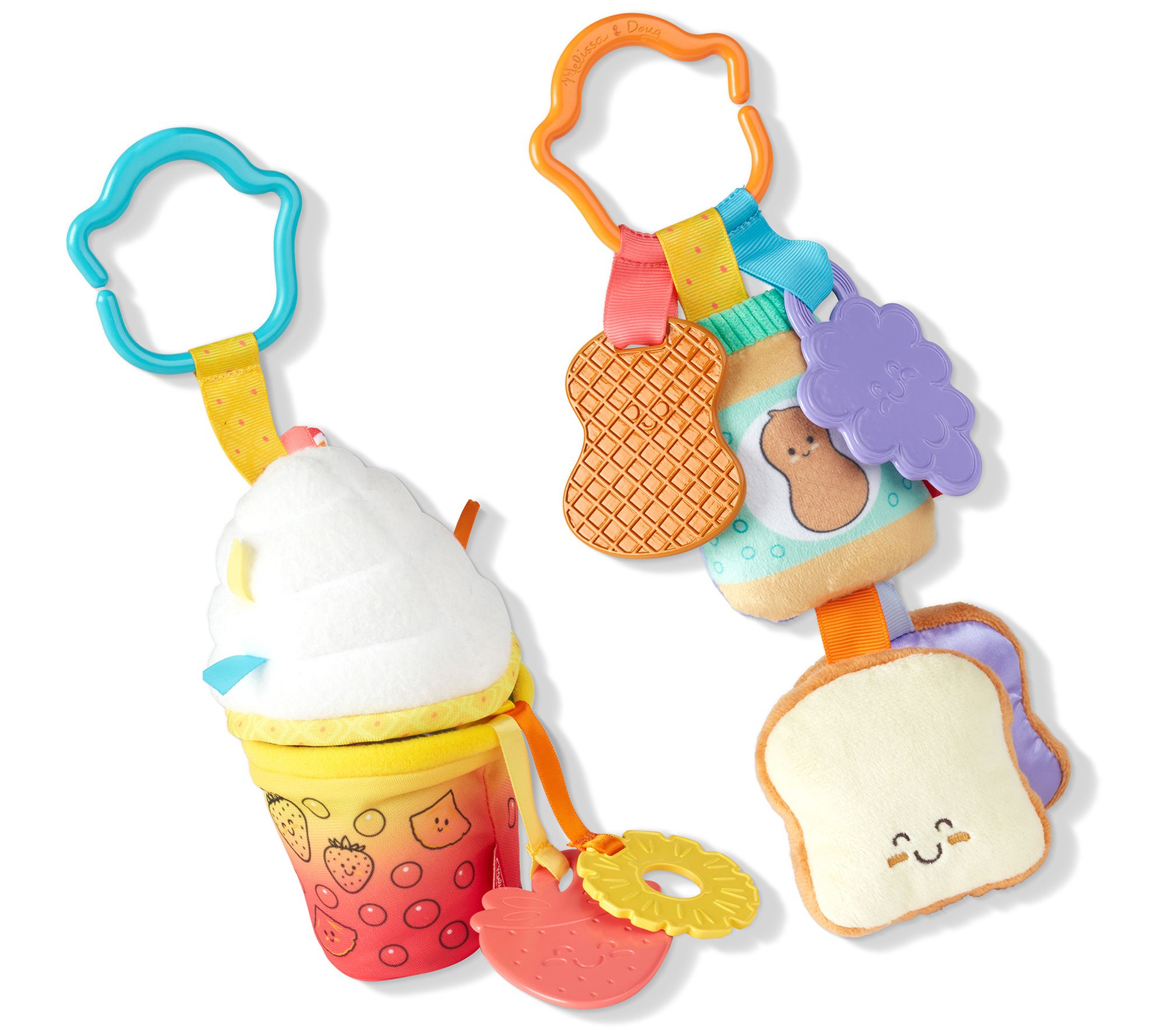 Bring smiles and delightful sensory play wherever your little one goes with this Melissa & Doug Take-Along Bundle. Easily clip these adorable, multi-textured toys onto a stroller, car seat, diaper bag, or high chair to keep them within reach. The PB&J sandwich and bubble tea are packed with textures and sounds to engage and entertain, fostering your child's development and curiosity. From Melissa & Doug.
