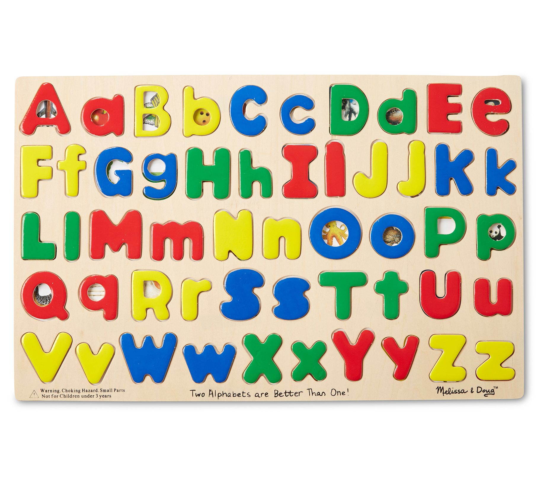 Help your little scholar learn both lower and upper case letters with the problem-solving fun of this wooden alphabet puzzle. From Melissa & Doug.
