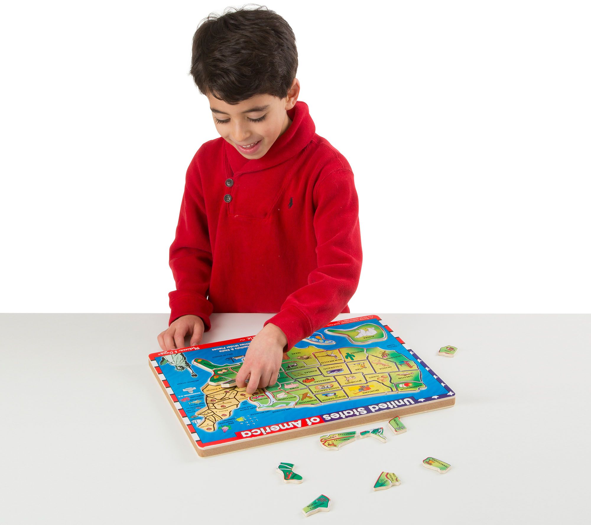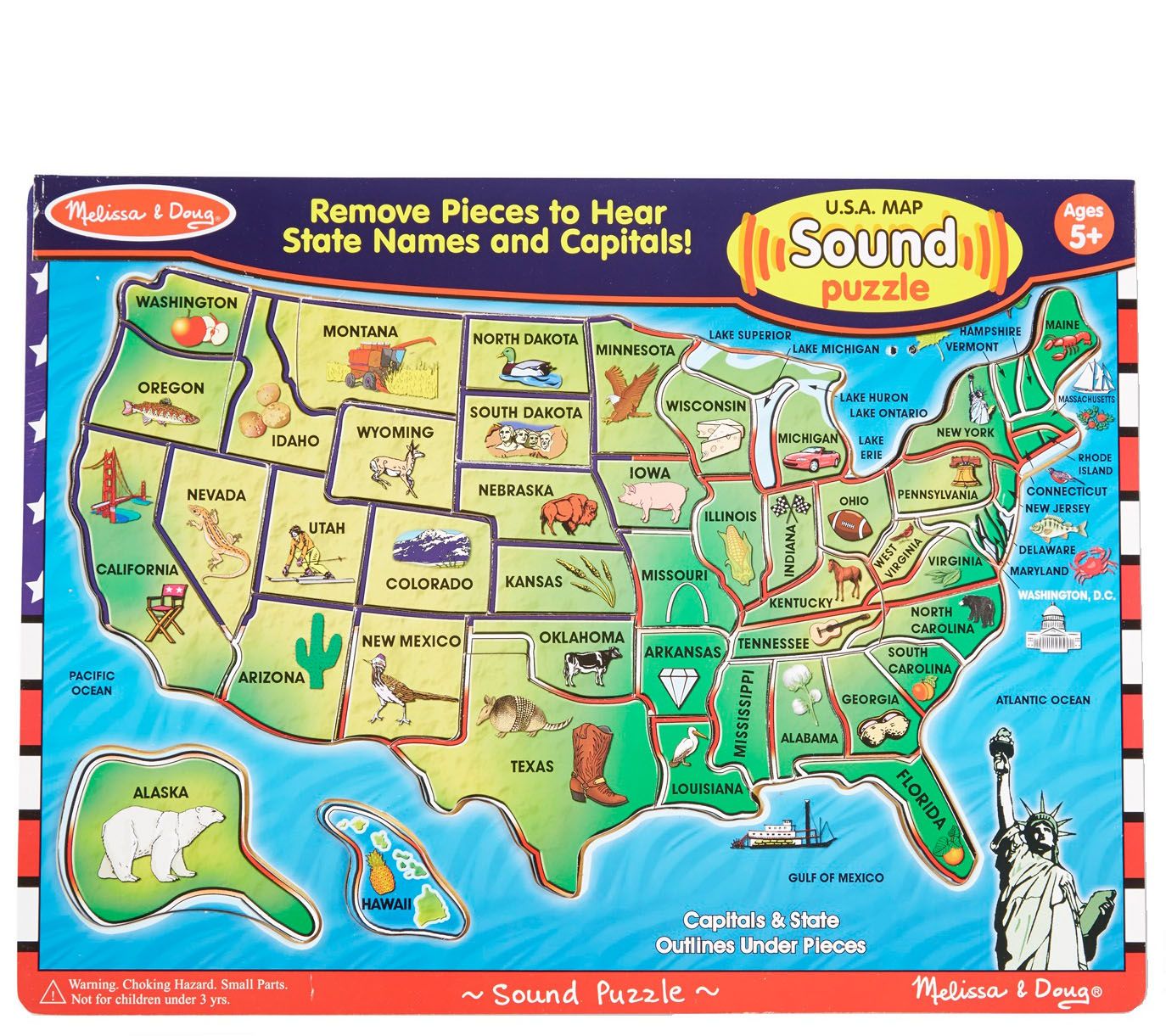 Help your little ones develop map and memory skills with this USA sound puzzle. When each piece is correctly placed, the puzzle pronounces the name and capital of each state to help reinforce the concept. From Melissa & Doug.