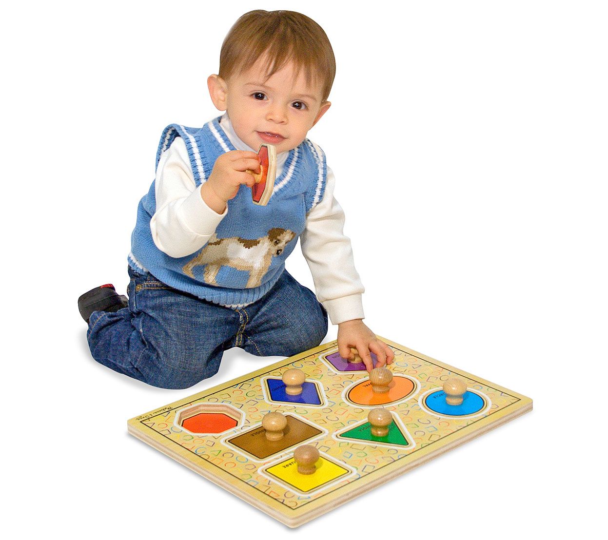 • Includes wooden shapes puzzle with eight pieces: circle, oval, pentagon, diamond, octagon, rectangle, square, and triangle