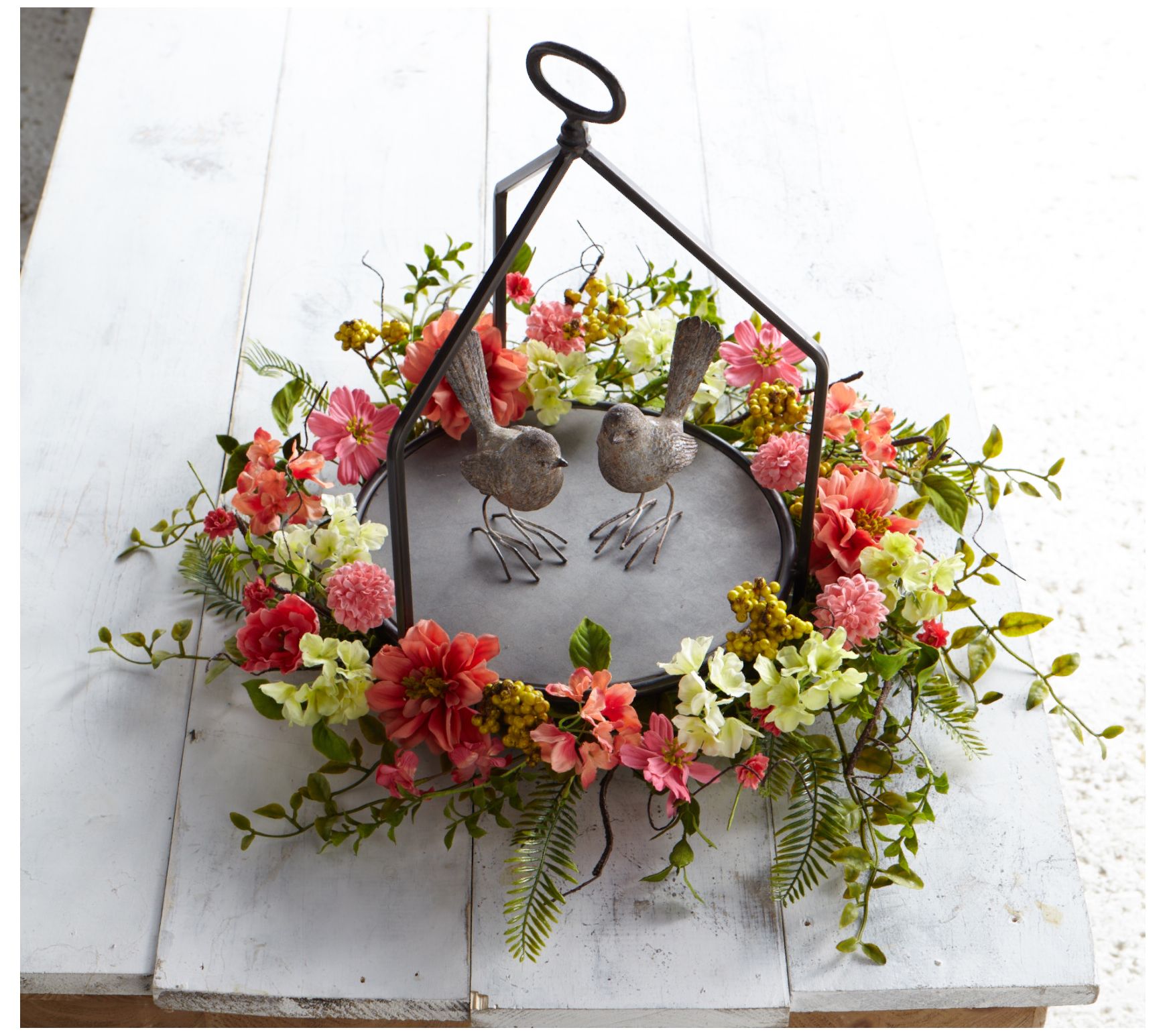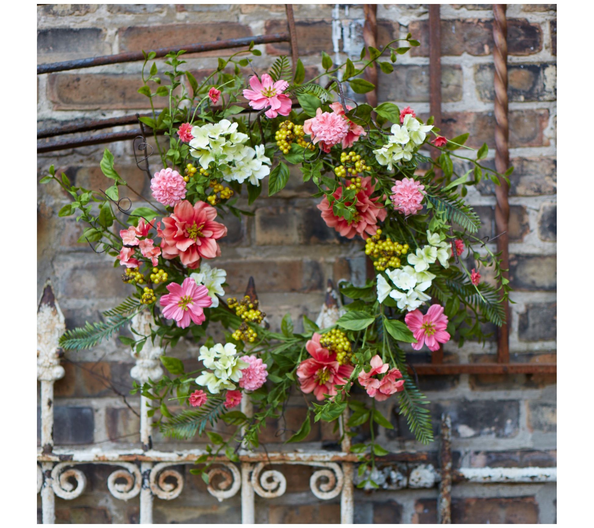 Showcasing lovely cosmos flowers accented by bright berries and lush foliage, this faux wreath welcomes guests to your home and brings charming cottage beauty to your door. From Melrose International.