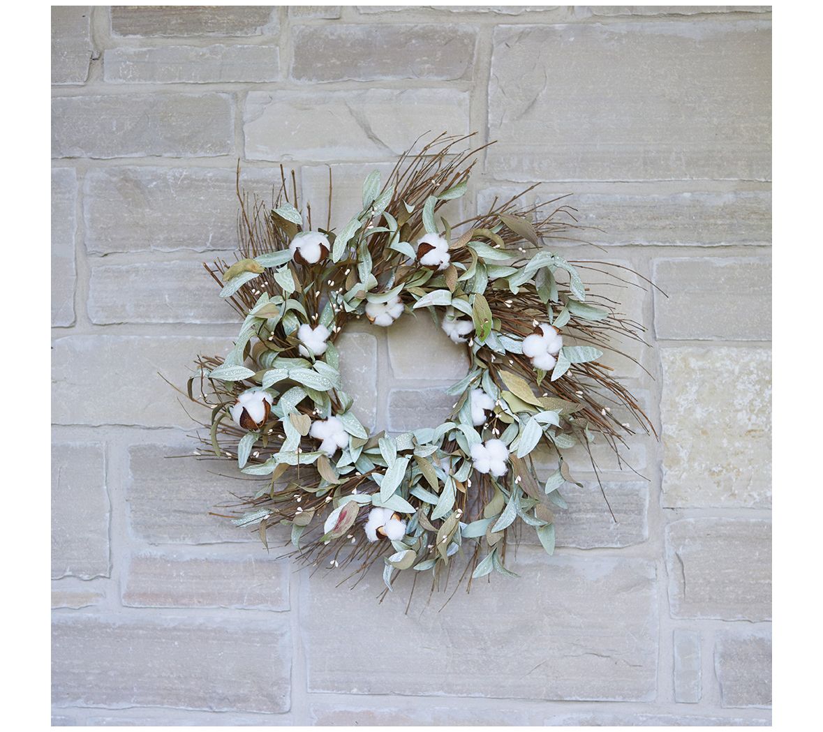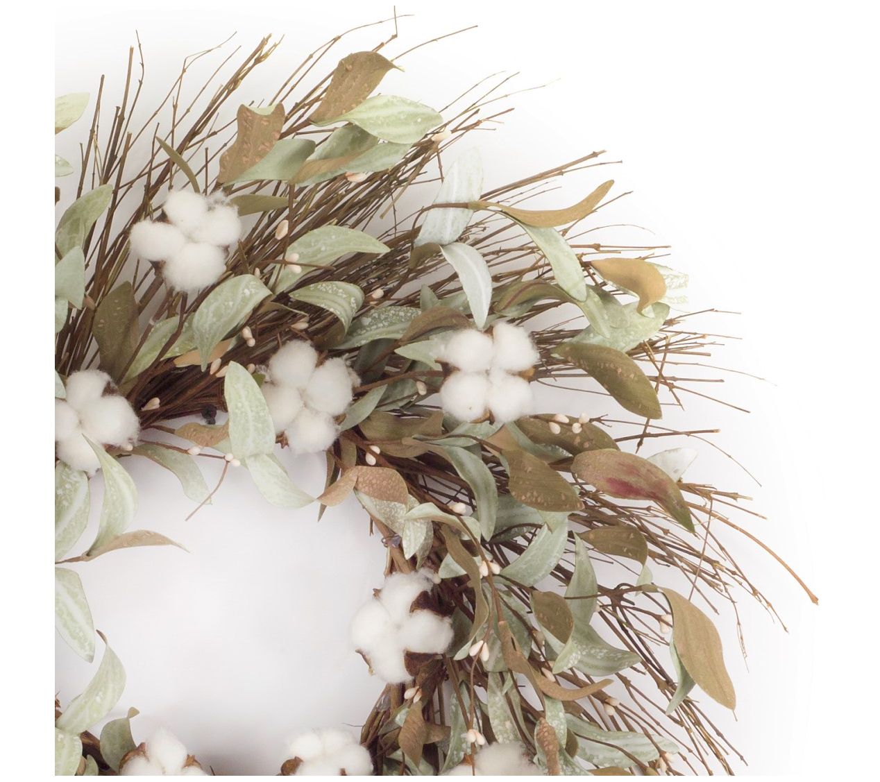 Showcasing cotton flowers paired with plenty of foliage, all set on a twig base, this beautiful faux wreath is perfect for adding a touch of nature to your front door. From Melrose International.