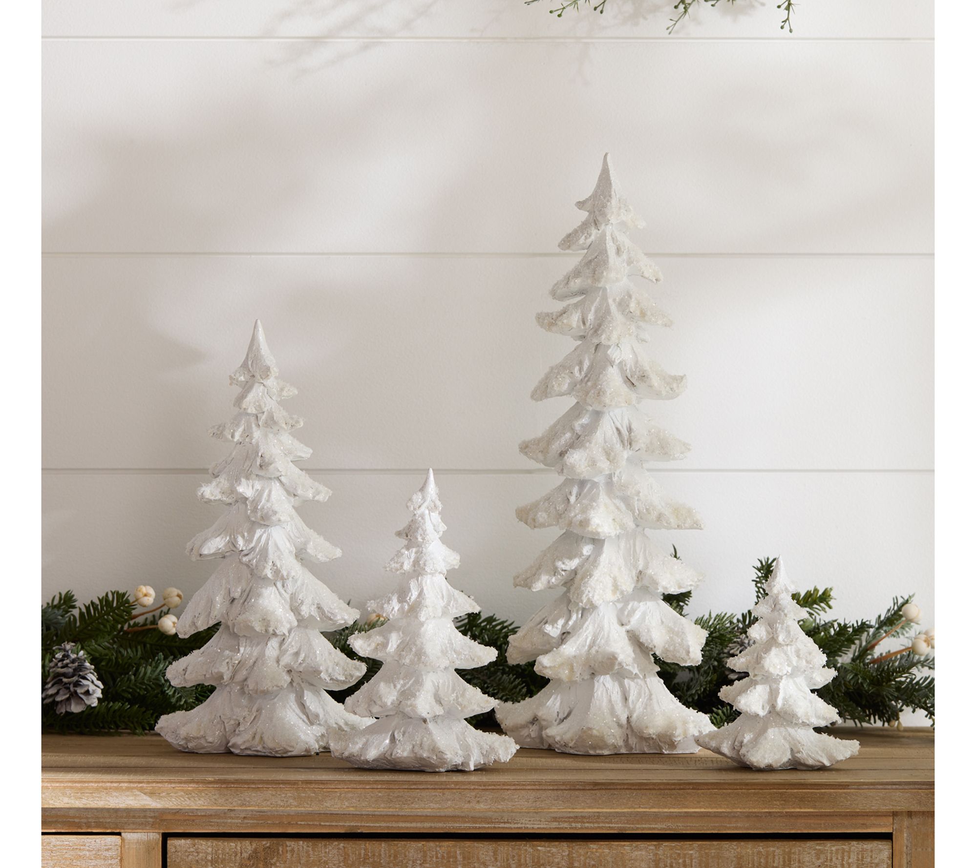Elevate your holiday decor with this pine tree set, a quartet that brings the serene beauty of winter indoors. Each piece in this set showcases a unique carved design, adorned with snowy flocked accents for a touch of rustic charm. Ideal for creating a cozy woodland or lodge cabin atmosphere, these trees are crafted from durable polyresin, ensuring they remain a part of your festive celebrations for years to come. From Melrose.