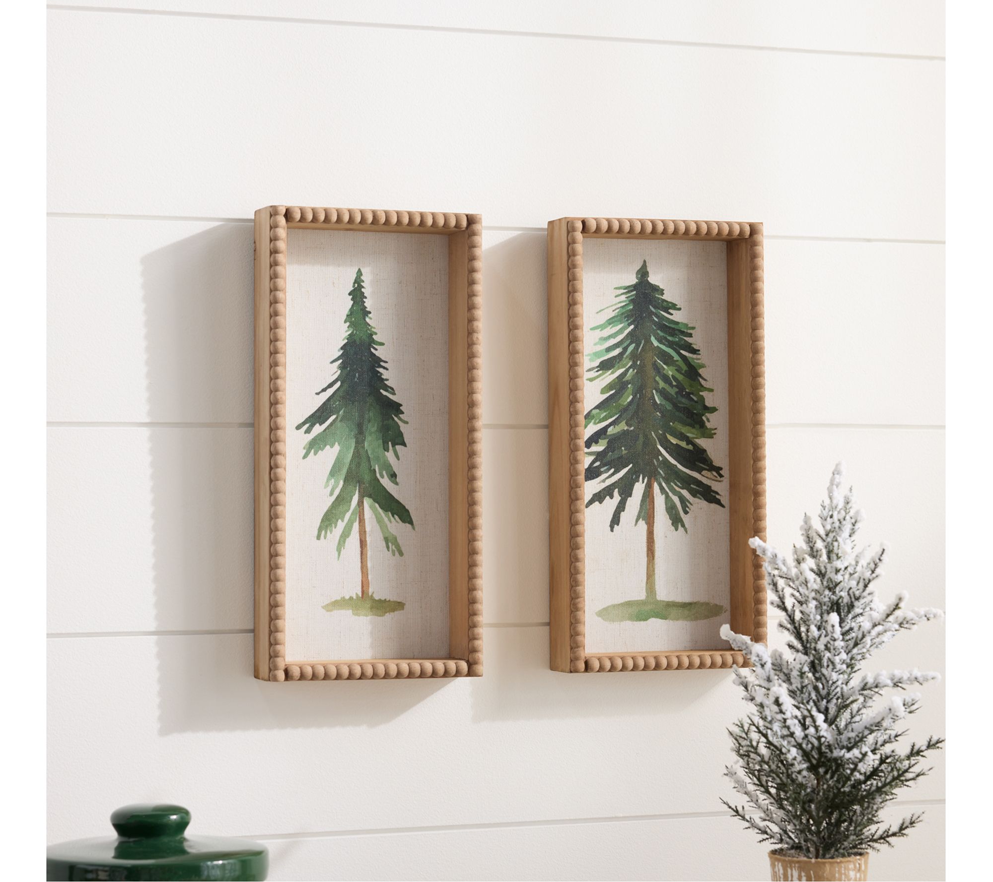 Bring the enchanting allure of the forest into your home with this set of framed pine tree plaques. This duo of wall decor, featuring traditional pine tree designs set against wintry green and brown tones and encased in rustic fir wood frames, promises to infuse your space with the warmth and joy of the holiday season. From Melrose International.