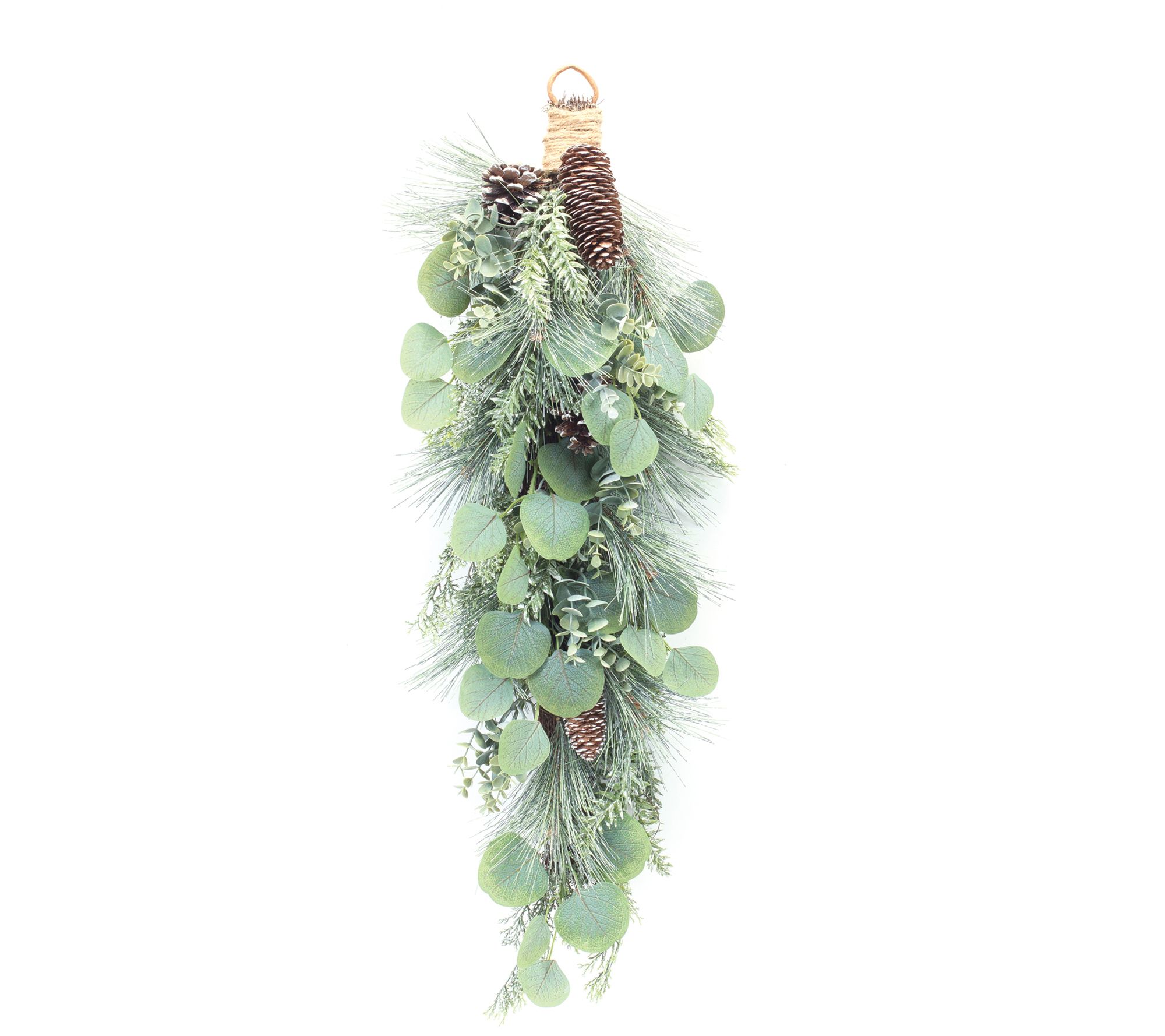 An elegant alternative to the classic wreath, this frosted pine and eucalyptus swag makes a festive and sophisticated addition to your entryway. From Melrose International.