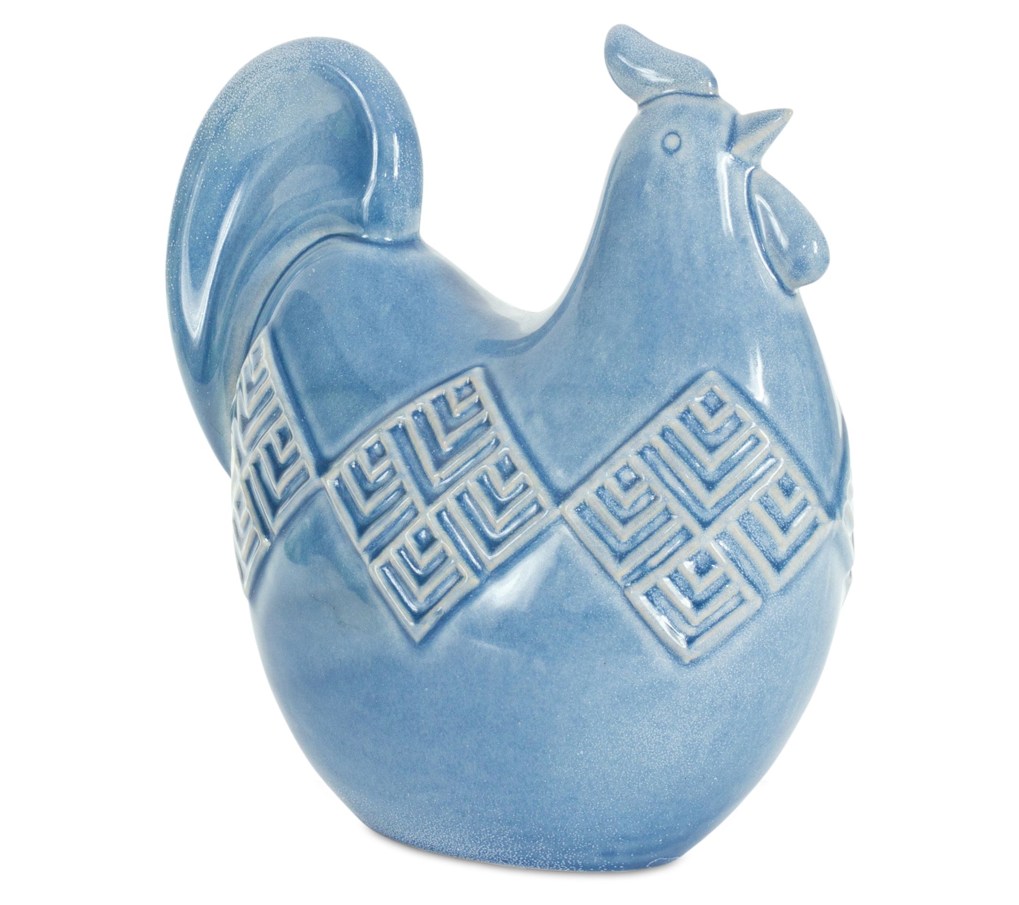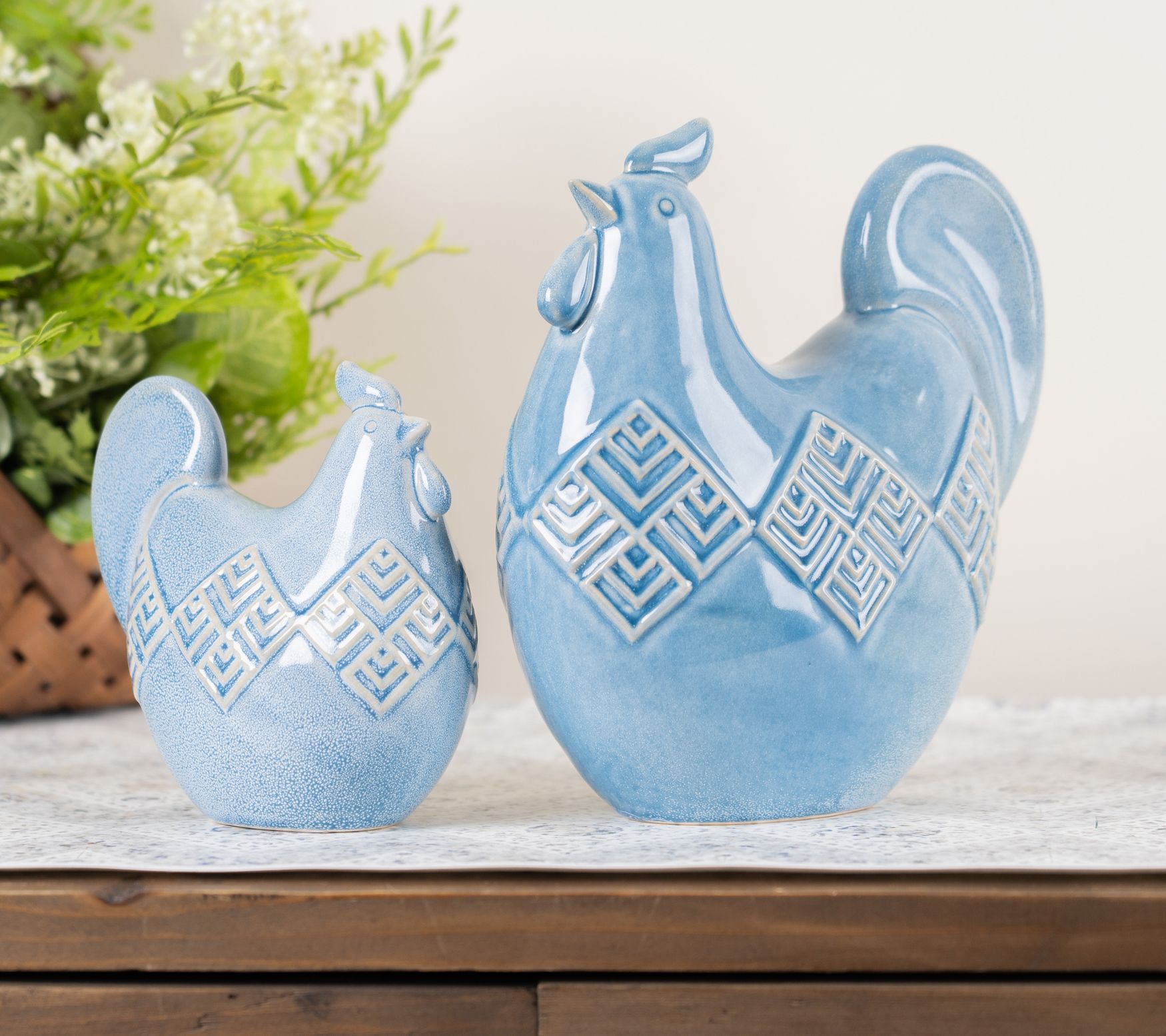 Showcasing cool blue tones and lovely details, this set of two ceramic chickens is the perfect way to add farmhouse-chic charm to a windowsill, kitchen counter, or mantel. From Melrose International.