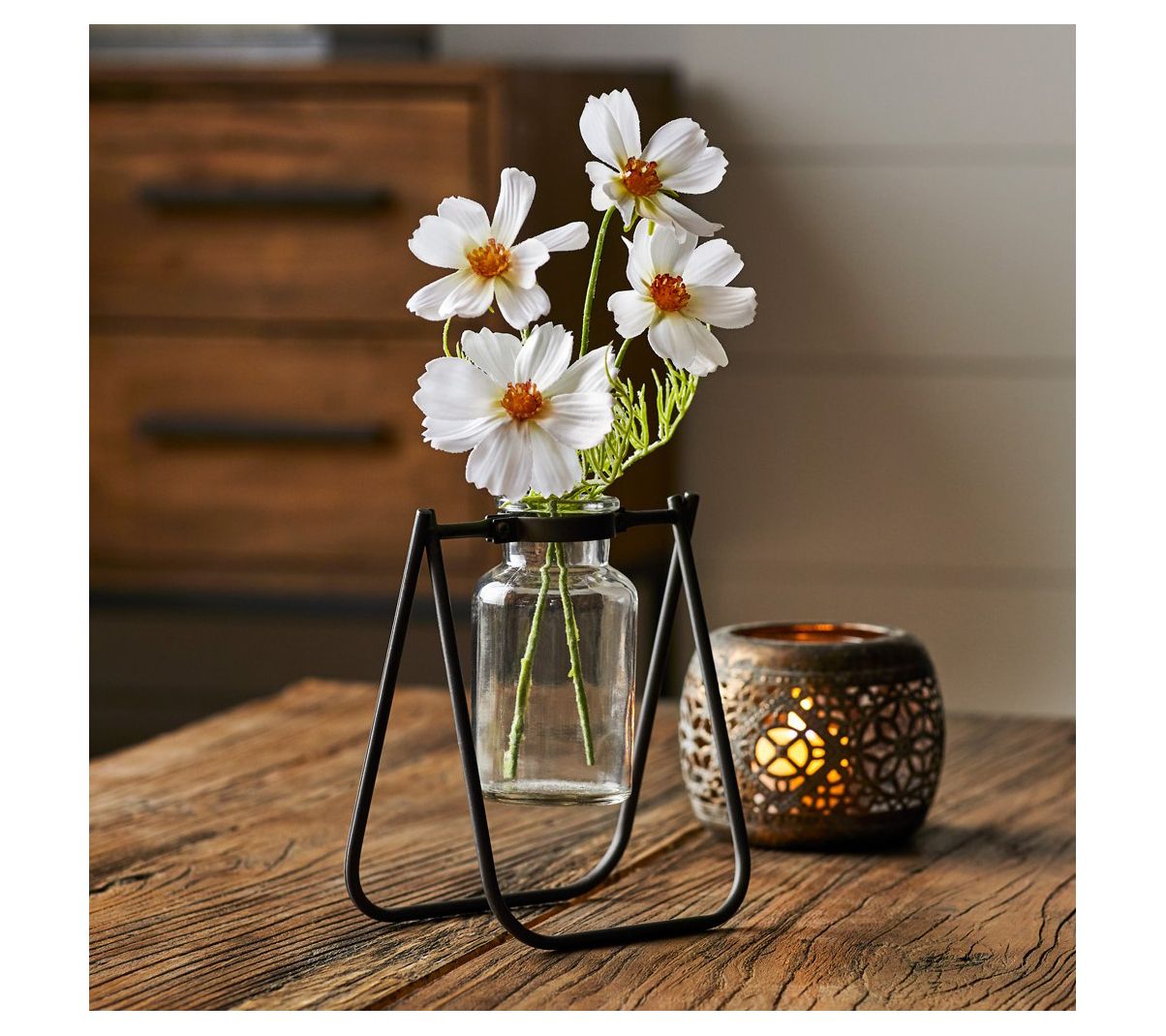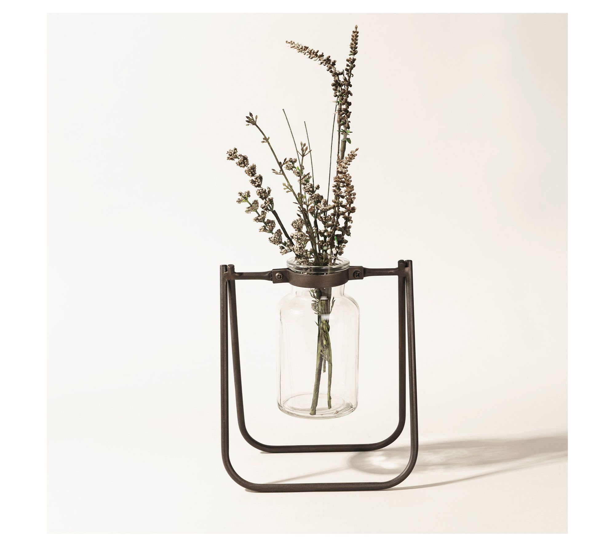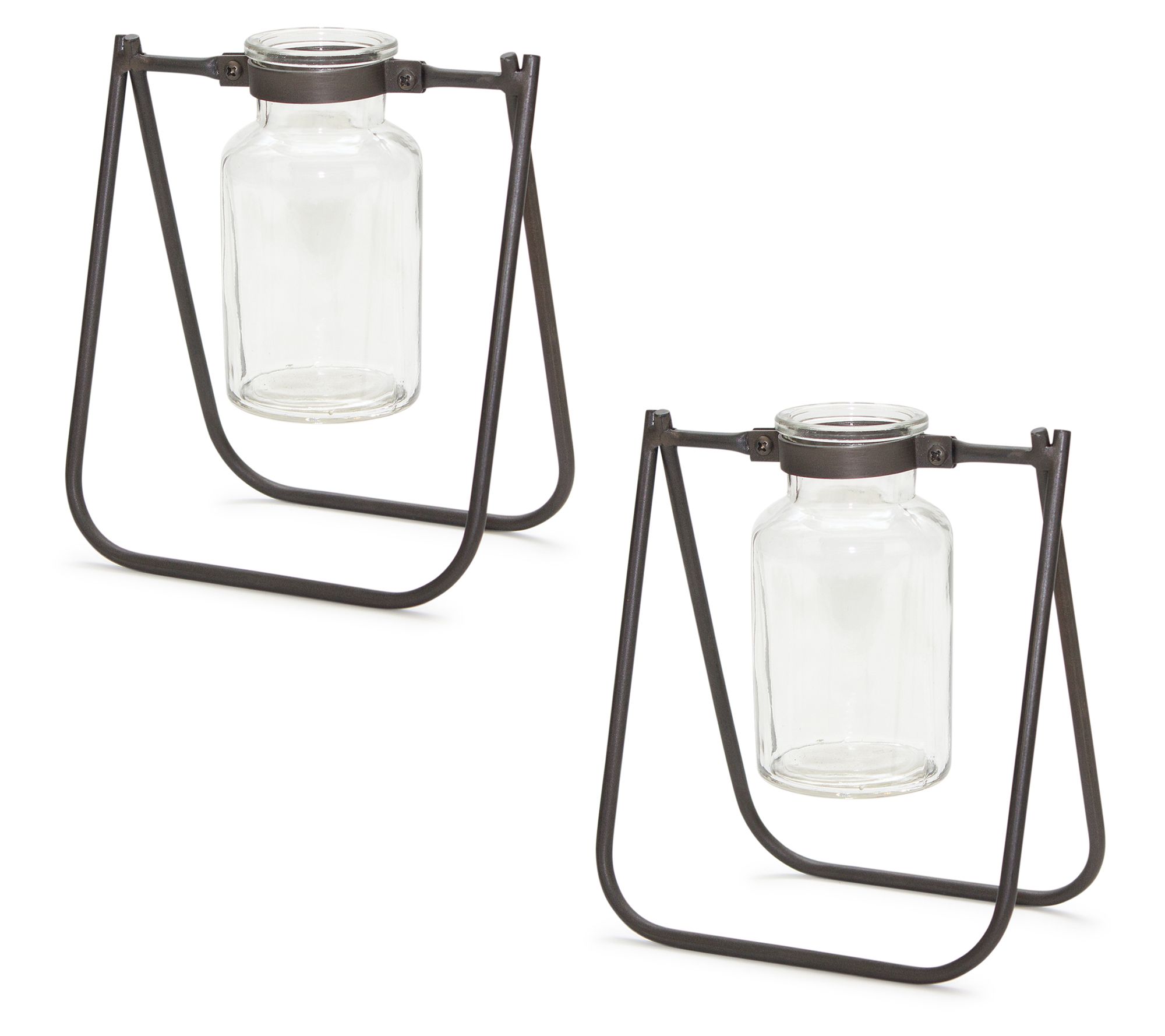 Bring a splash of rustic style to your space with this set of two jar vases, each featuring an open metal stand and loads of vintage-inspired charm. From Melrose International.
