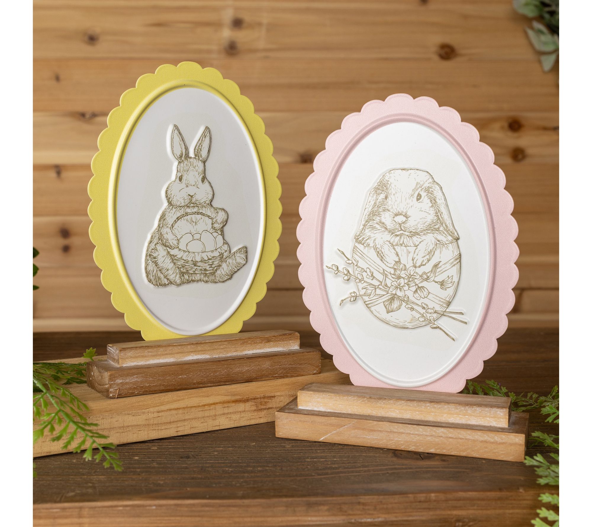 • Features pastel-framed oval plaques with embossed bunny illustrations