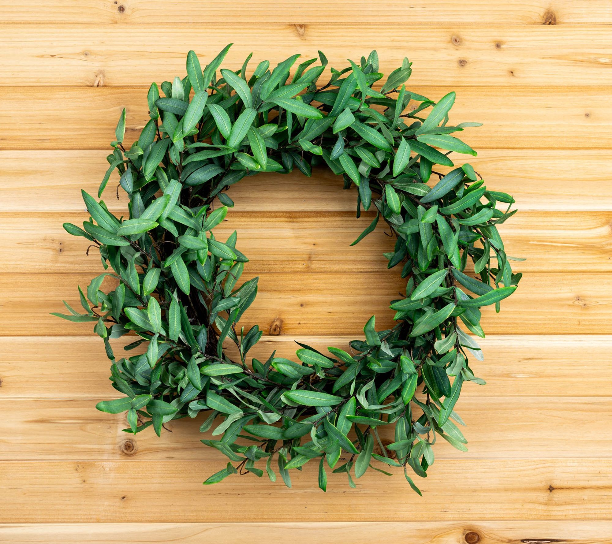 Lush olive leaf foliage and rustic twig accents make this lifelike wreath a welcoming addition to your home decor, bringing a touch of greenery that lasts through any season. Whether displayed on your front door, entryway, or mantel, its believable design and sturdy base create a warm, elegant atmosphere indoors or on a covered porch. From Melrose International.