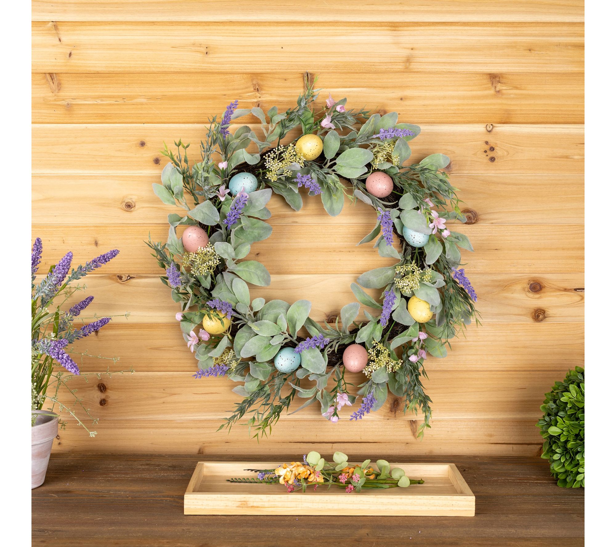 • Features lush lifelike greenery, pastel eggs, and delicate floral accents for a fresh spring look
