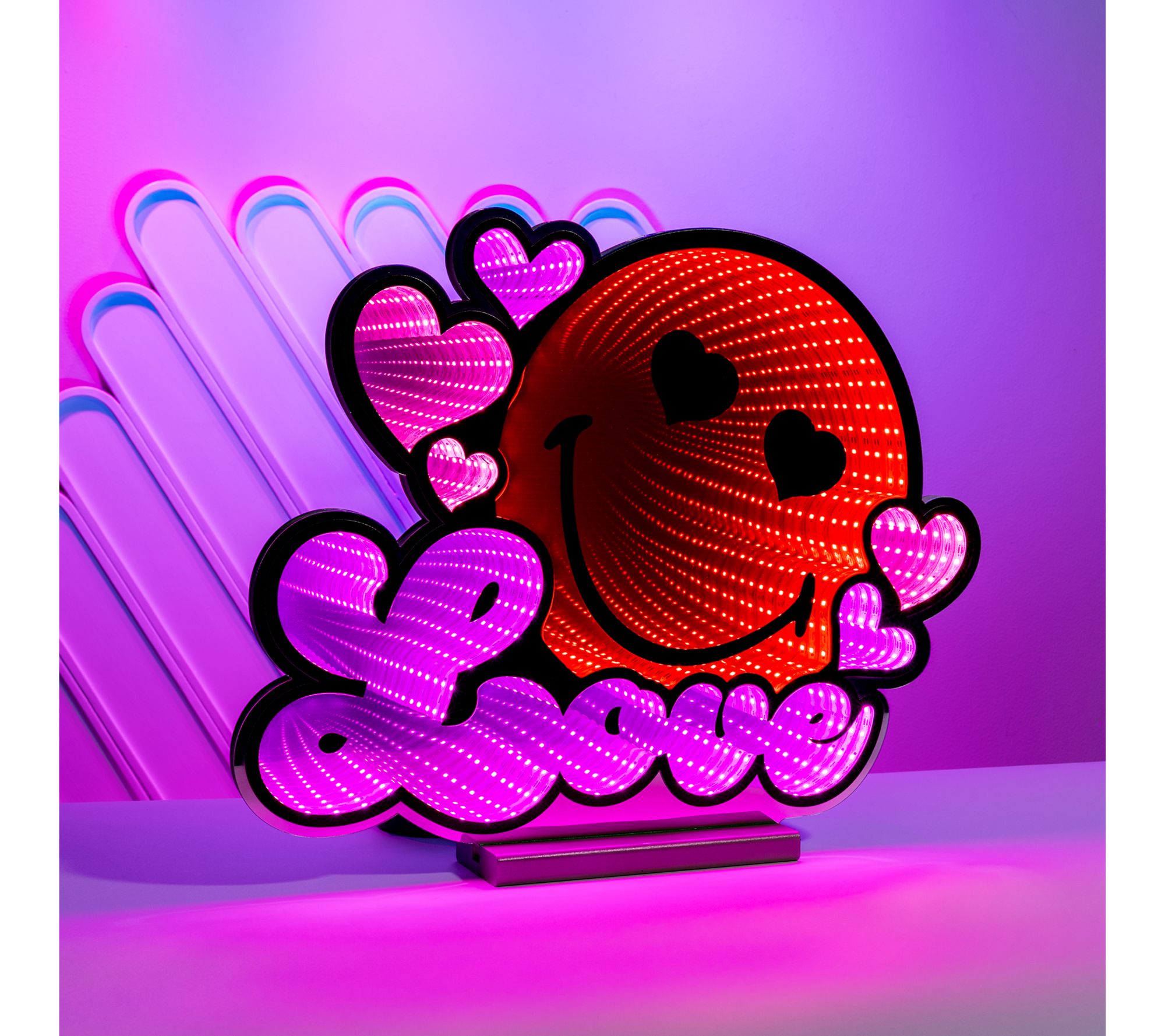 • LED infinity light pairs a glowing heart with the iconic SmileyWorld expression