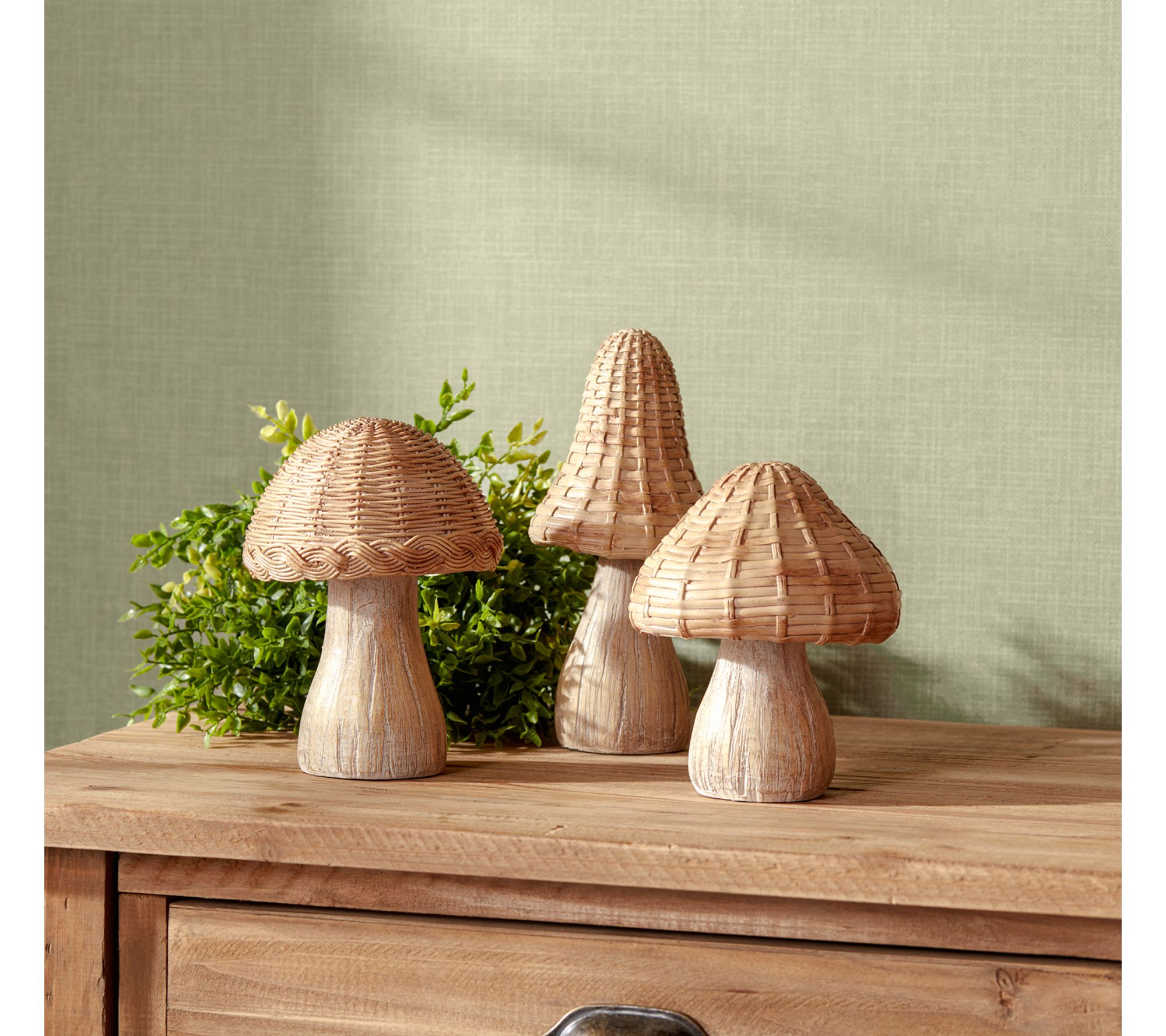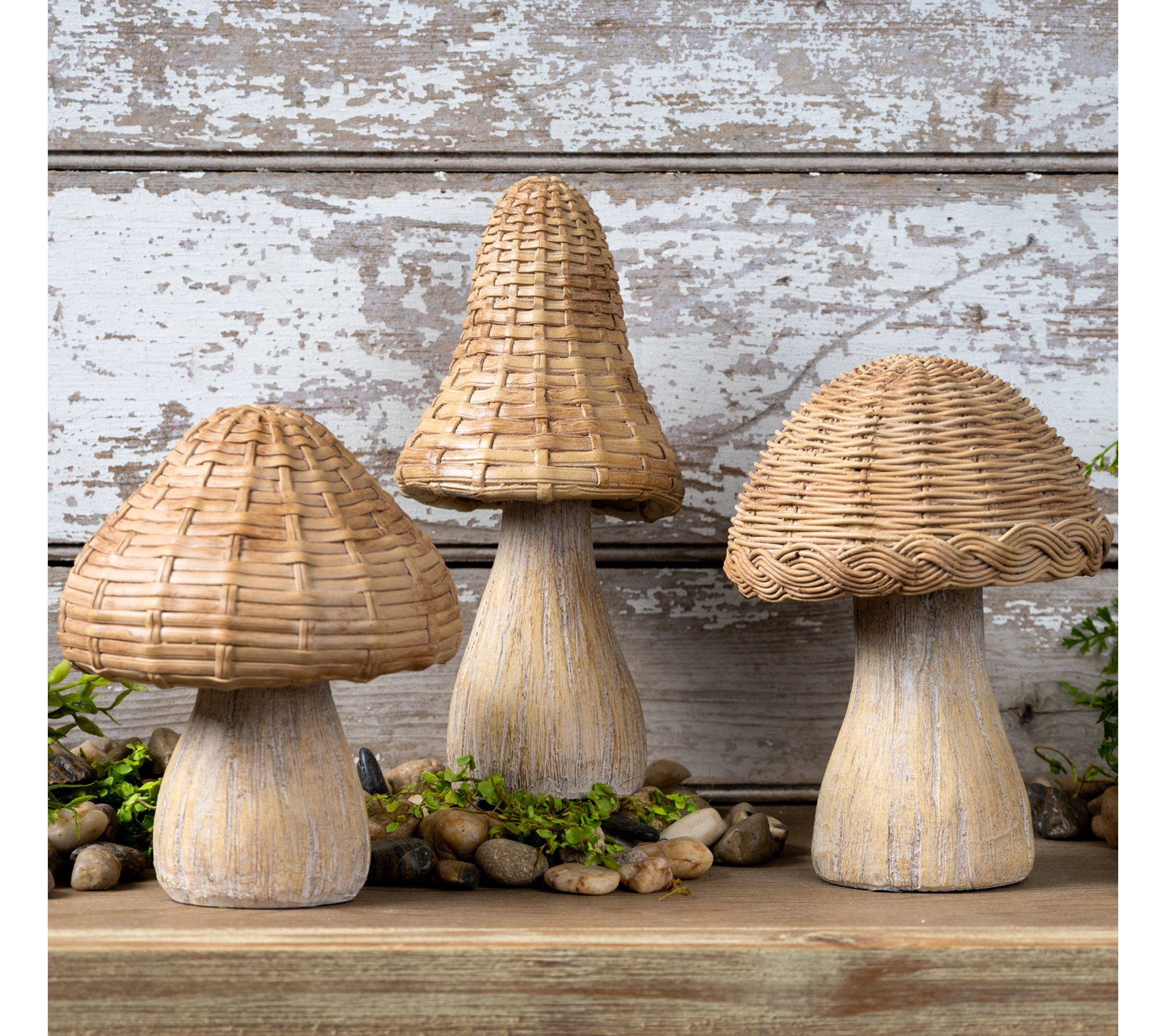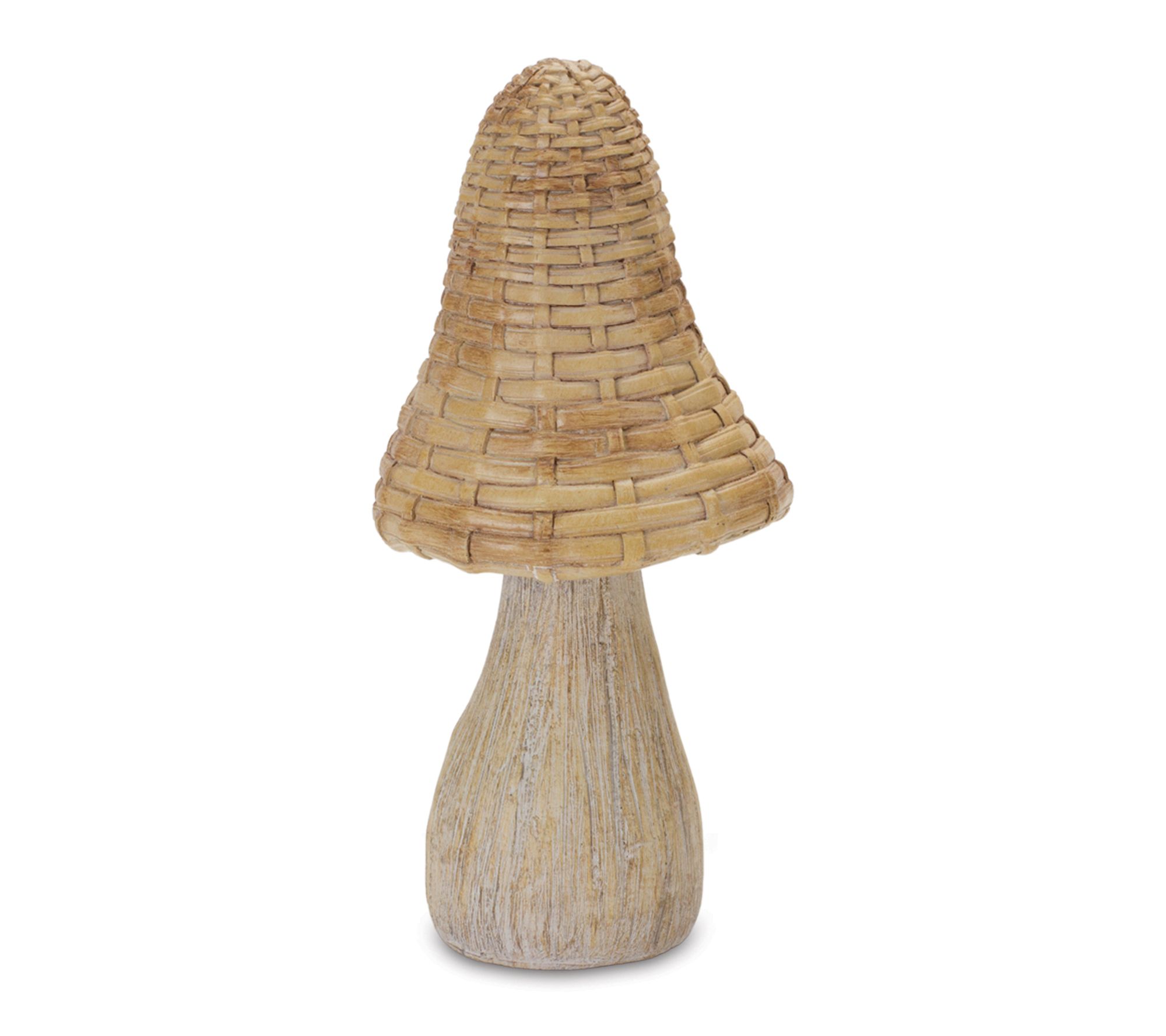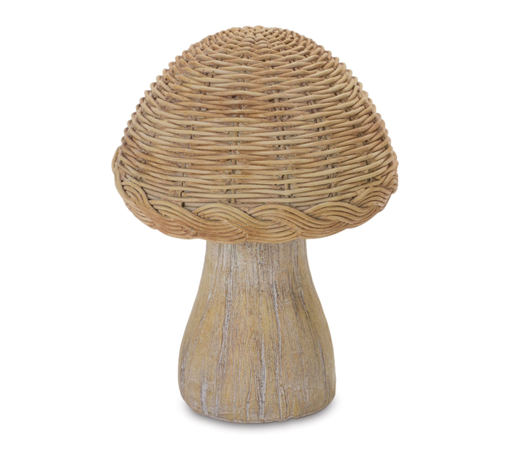 Bring a sense of woodland wonder to your decor with these whimsical wicker mushroom figurines. Crafted from durable resin and designed with etched wood grain stems and charming wicker-inspired tops, they add warmth to fairy gardens, patios, or any nook in need of a playful, nature-inspired accent. From Melrose International.