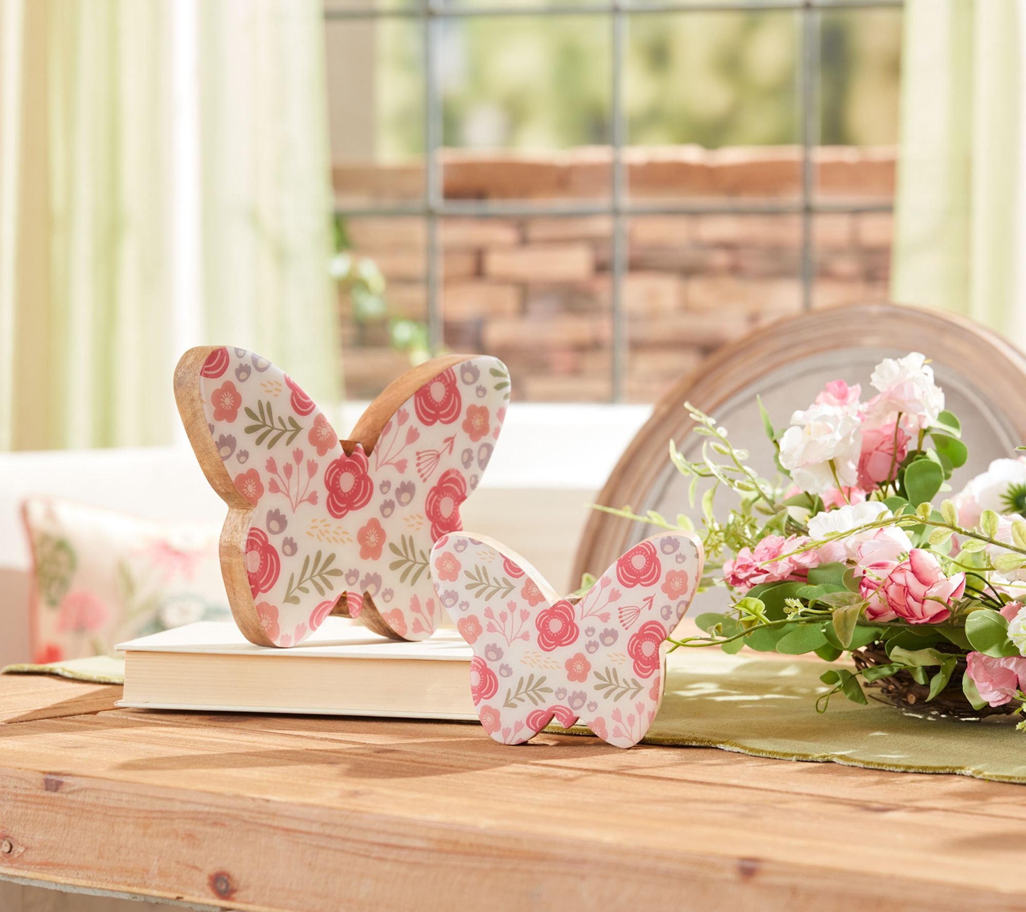 Bring a splash of garden-inspired charm indoors with this set of two floral butterfly figurines. Crafted from wood and adorned with vibrant blooms in cheerful pinks, purples, and greens, these playful accents brighten a shelf, mantel, or tabletop while lending a whimsical touch to your decor. From Melrose International.