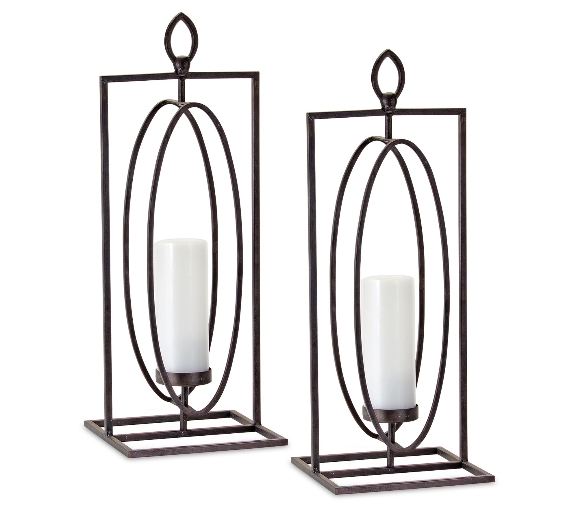 Light the way in chic style with this iron candle holder duo that combines contemporary appeal with a classic design. Use them to handsomely house your favorite wax or LED candles. From Melrose International.