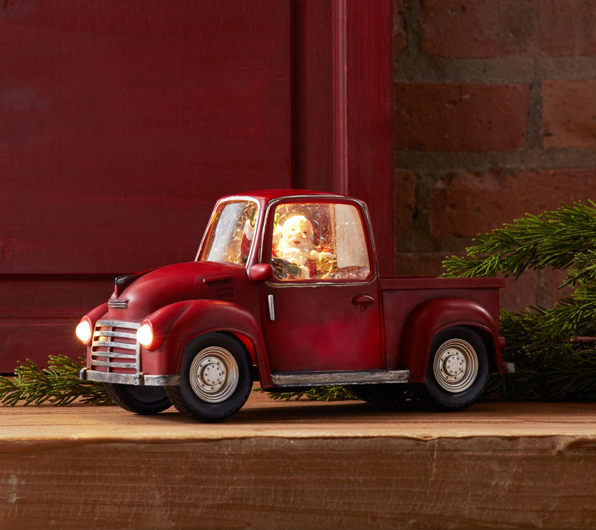Deck the halls with festive spirit by setting out this light-up snow globe truck featuring Santa Claus himself at the wheel. From Melrose International.