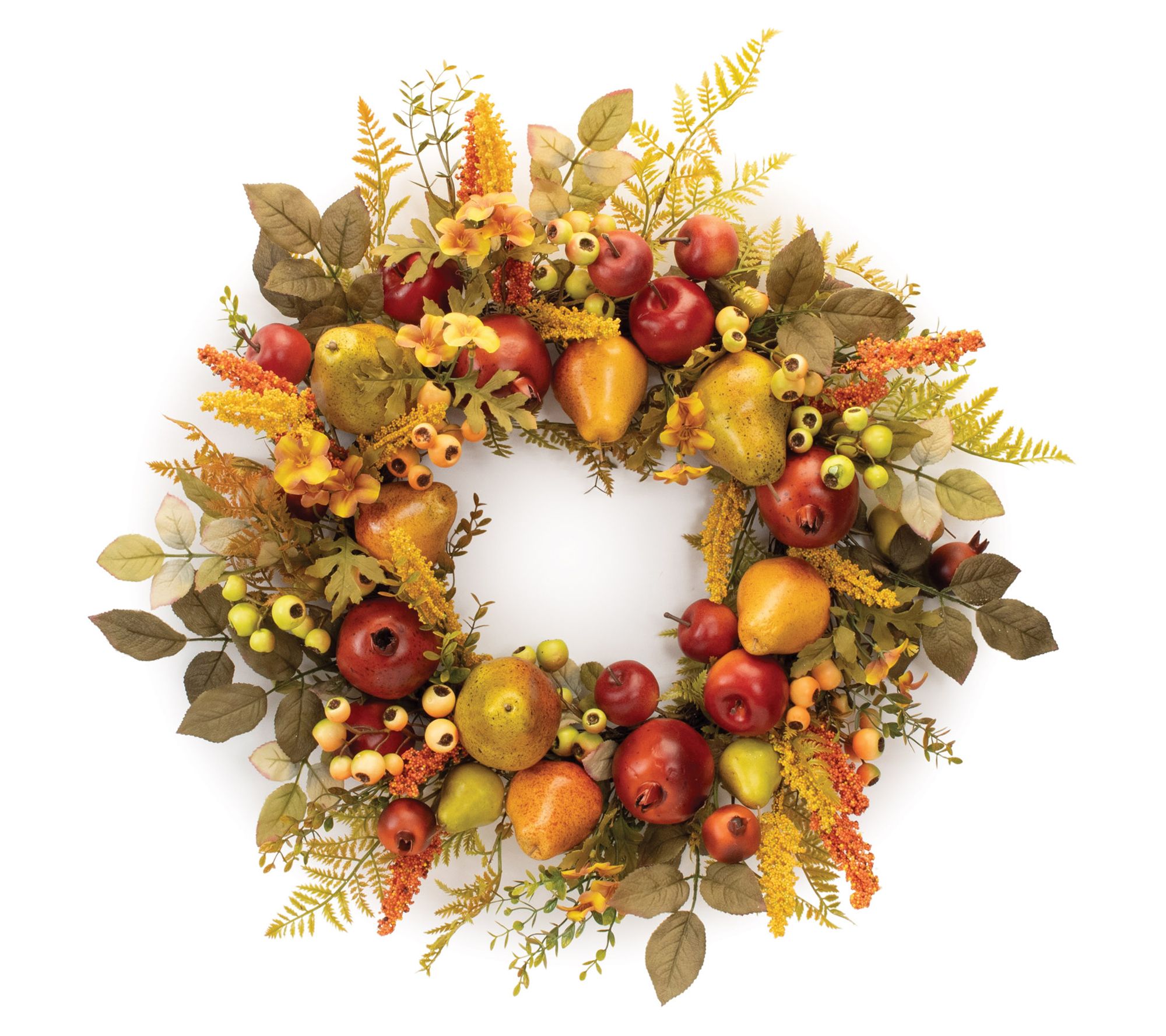 Welcome guests to your home with the Melrose mixed fall foliage and fruit wreath! Featuring rustic orange, yellow, and green tones, this wreath is adorned with pear, apple, and fig berry accents, perfect for adding a welcoming touch of nature to your space this autumn. From Melrose.