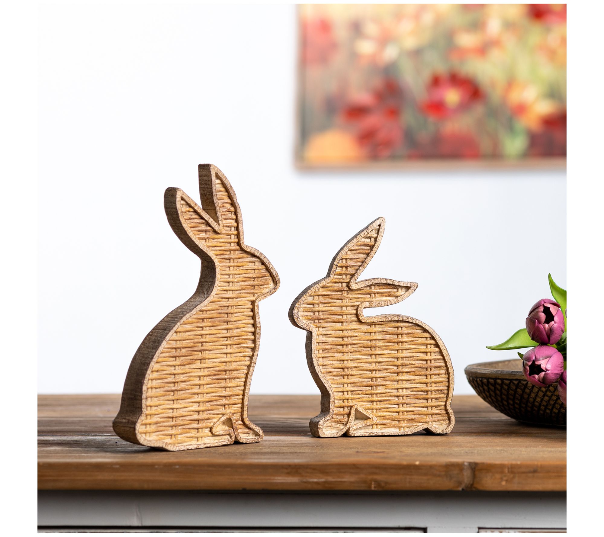 Celebrate the season with rustic flair! These adorable resin rabbit figurines look like they're made with woven wicker to bring a touch of homespun charm to your decor. From Melrose International.