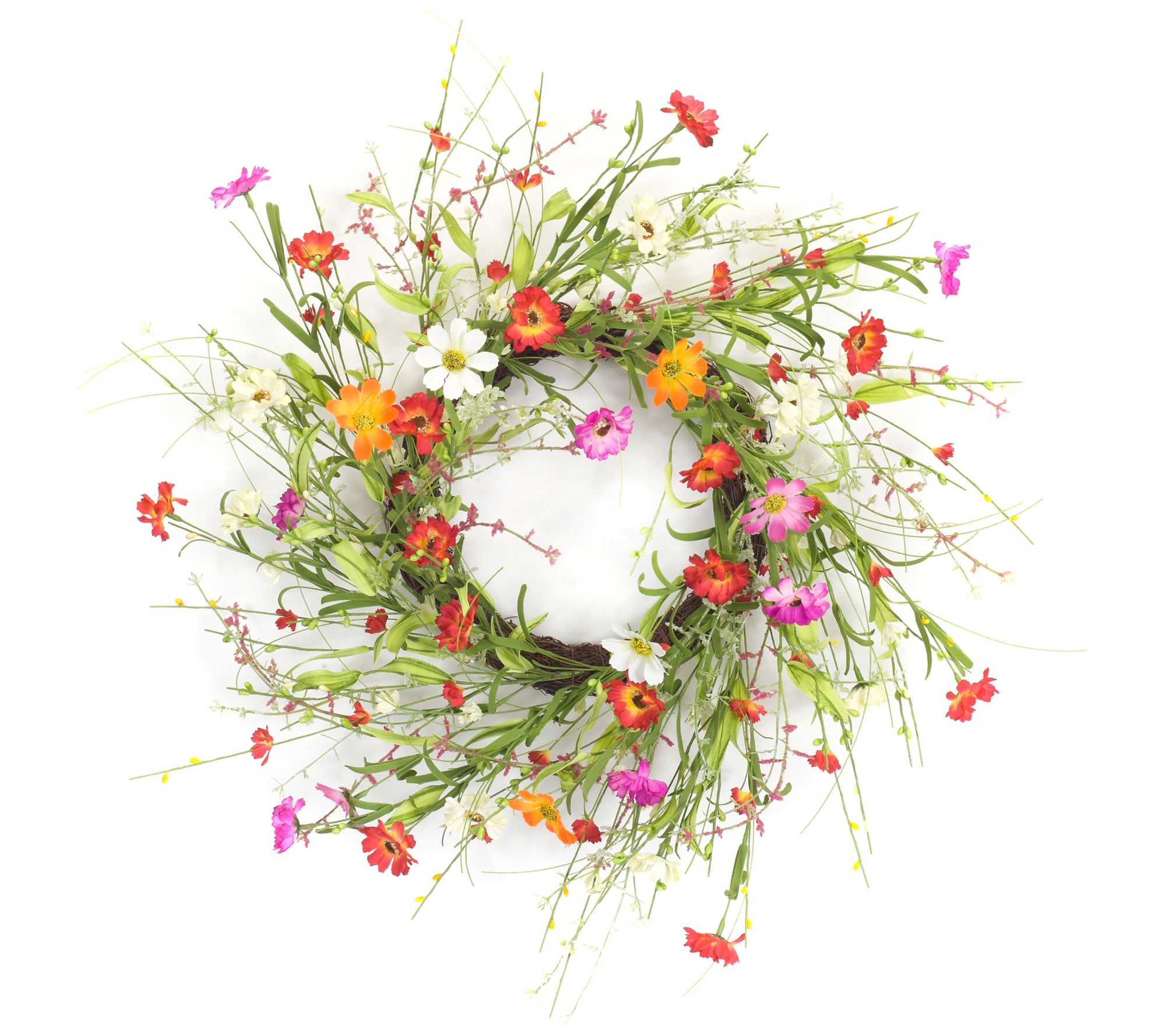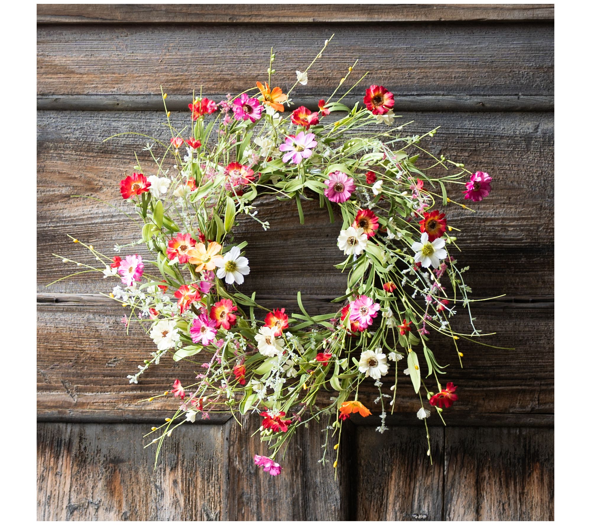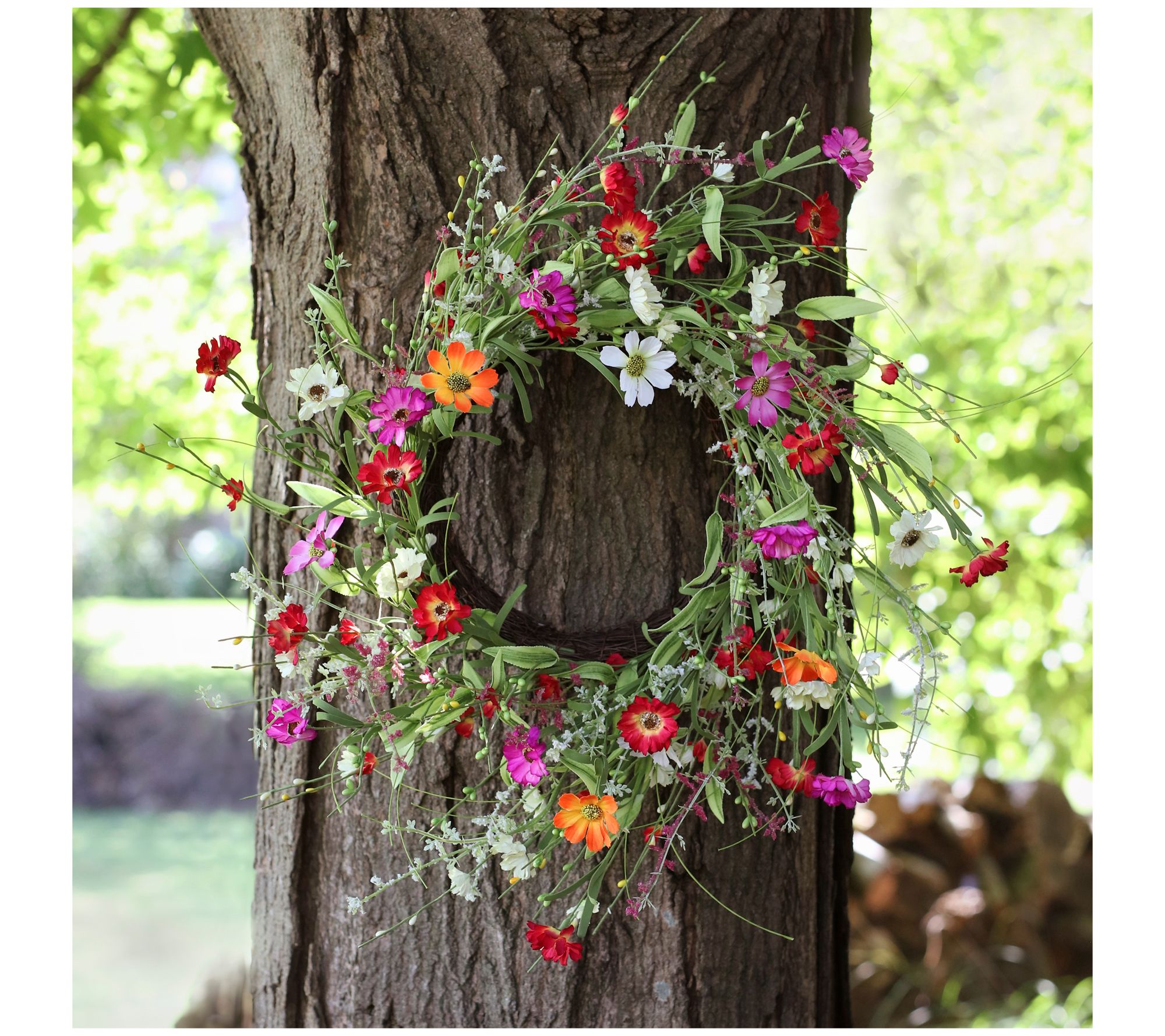 Welcome guests as you bring a touch of cottage charm to your door with this lovely faux wreath, showcasing multicolored wildflowers and lifelike foliage set on a twig base. From Melrose International.