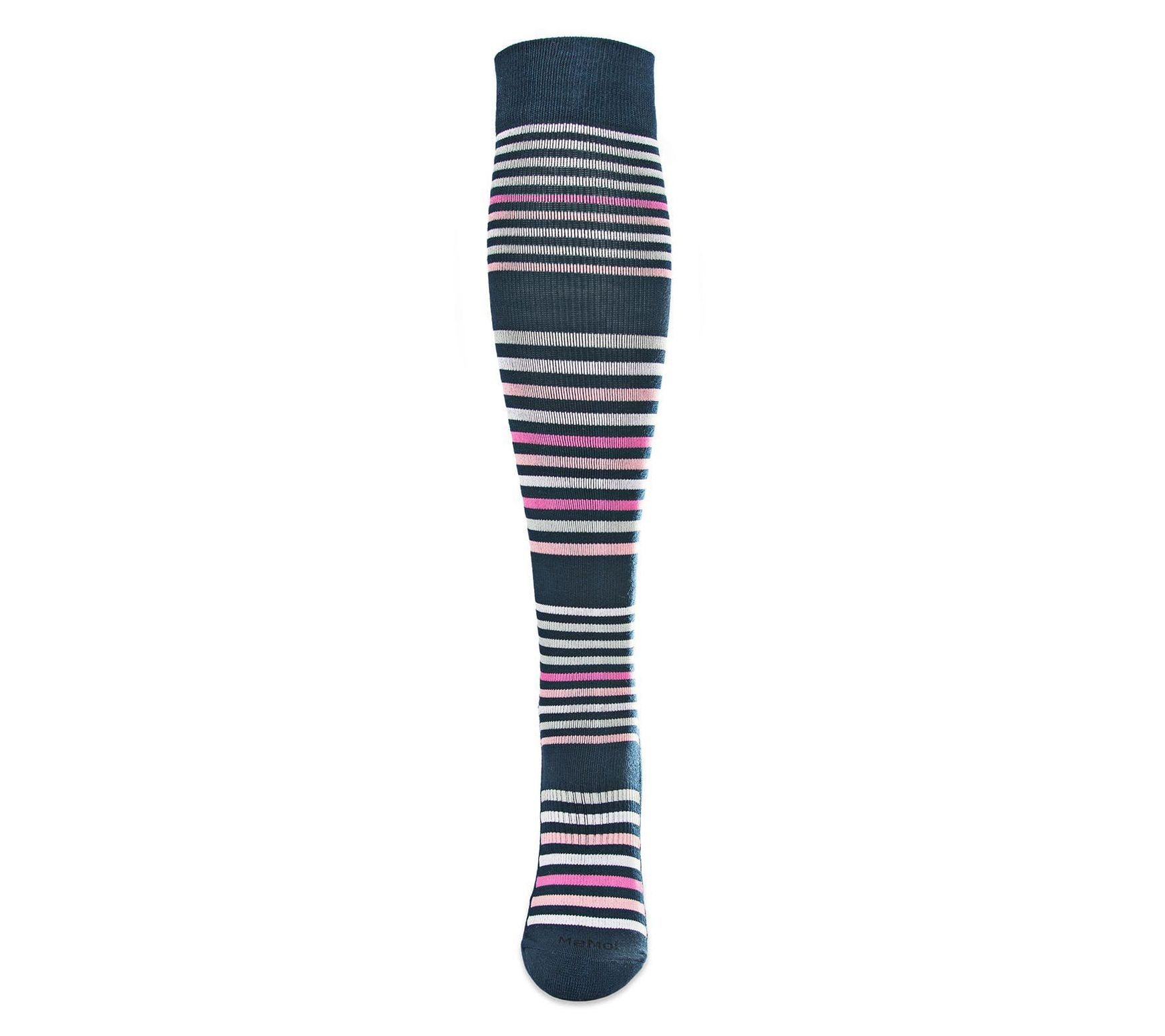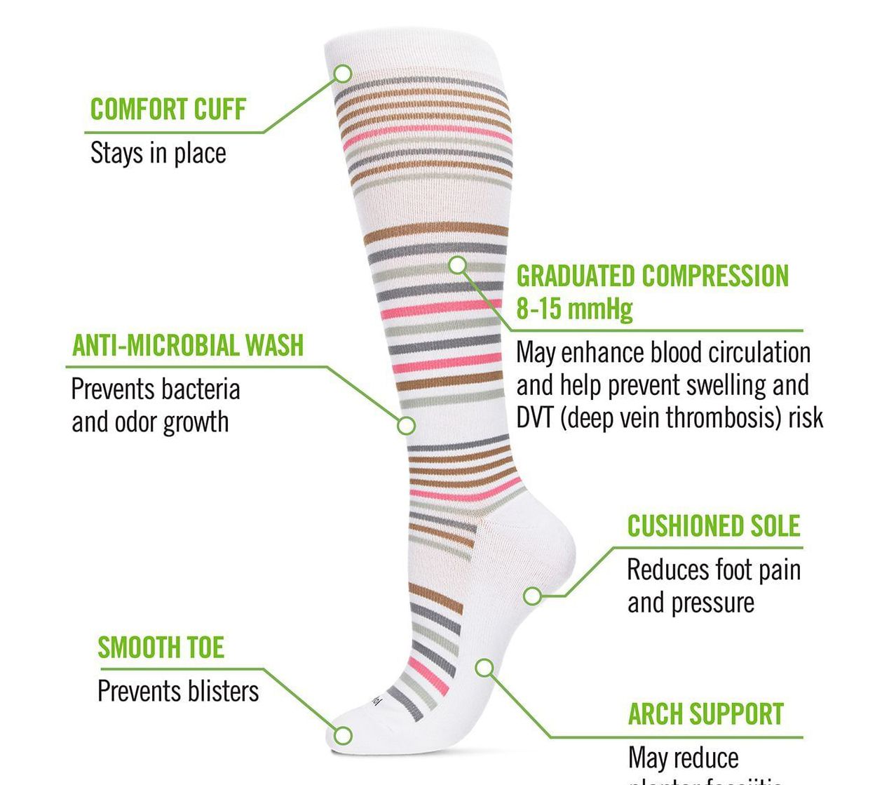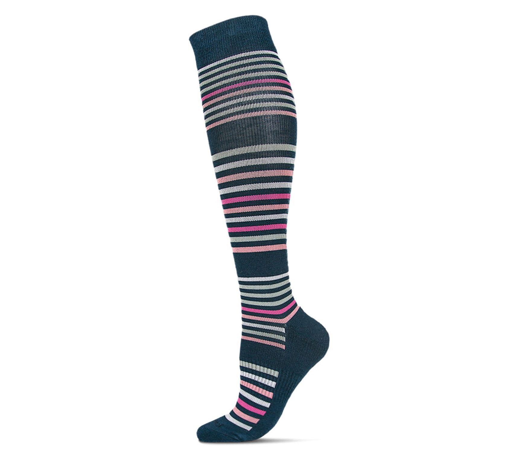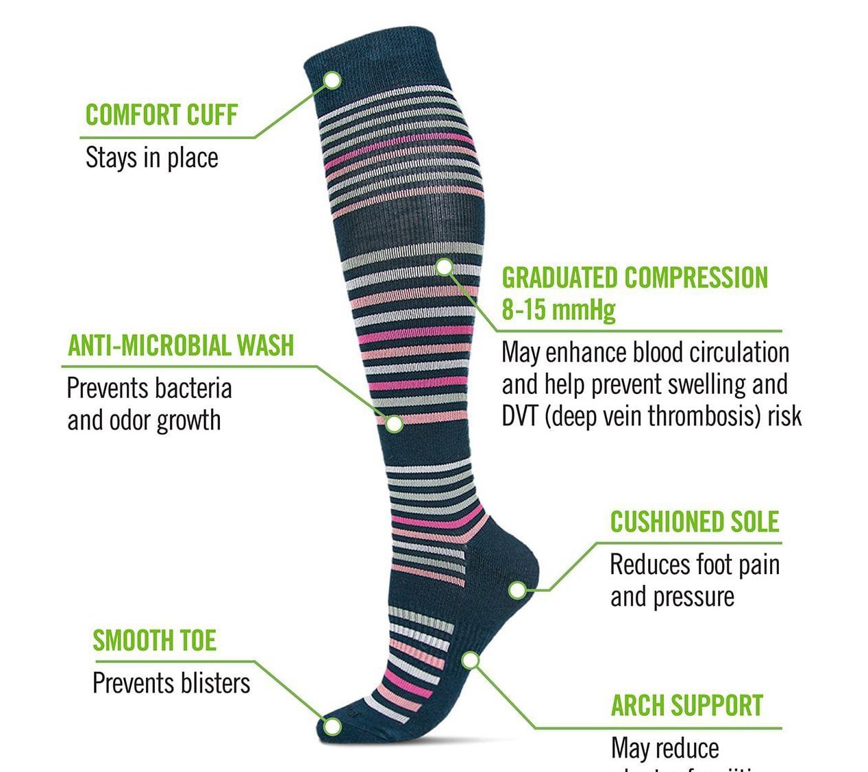 These graduated compression socks are perfect for busy travelers, active athletes, and long days at the office. Featuring a comfort cuff that provides a smooth, non-slip fit, and a cushioned sole, they help you stay comfortable all day. From MeMoi.