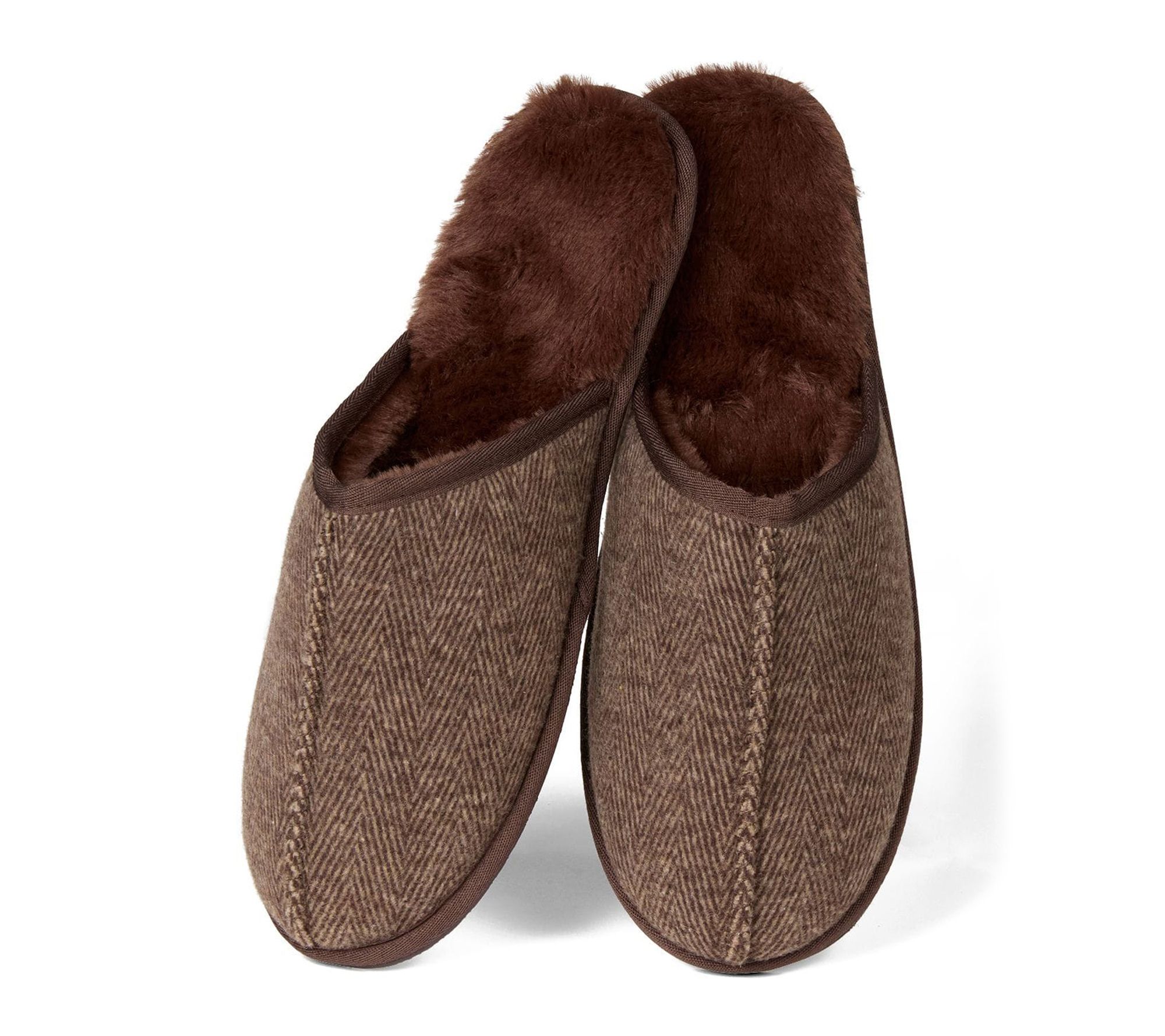Slip your feet into the cozy comfort of these herringbone tweed scuff slippers for moments when you want to unwind after a busy day. The plush lining surrounds your feet with warmth, making them a great companion for lounging at home or stepping out to grab the morning paper. From Memoi.