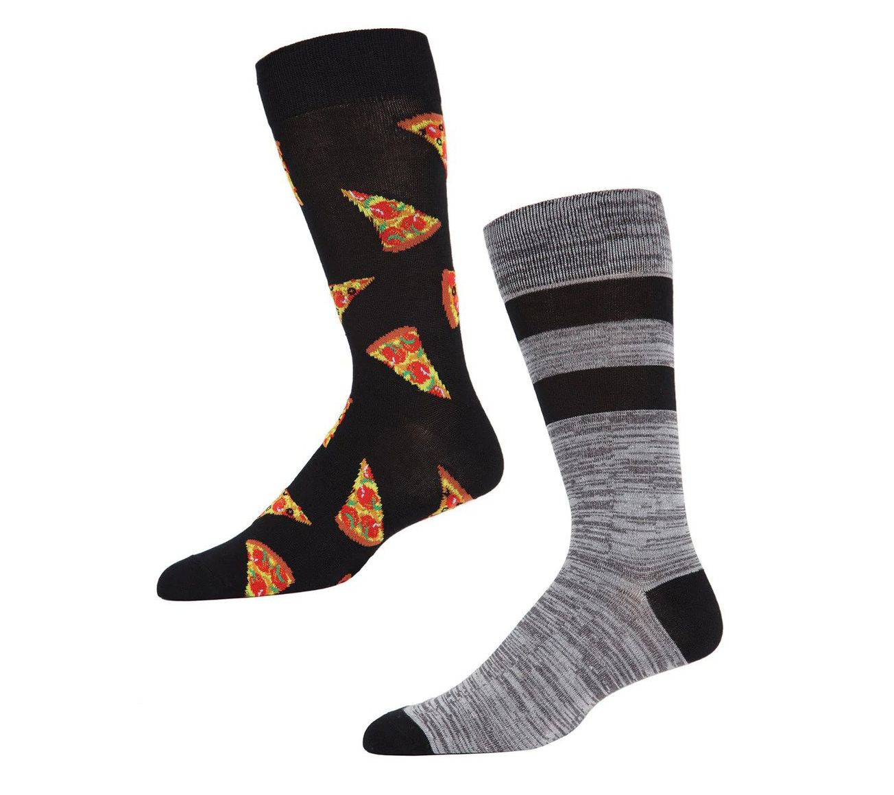 One pair of these crew socks features a fun pizza pattern, while the other features wide heathered stripes. From Memoi.