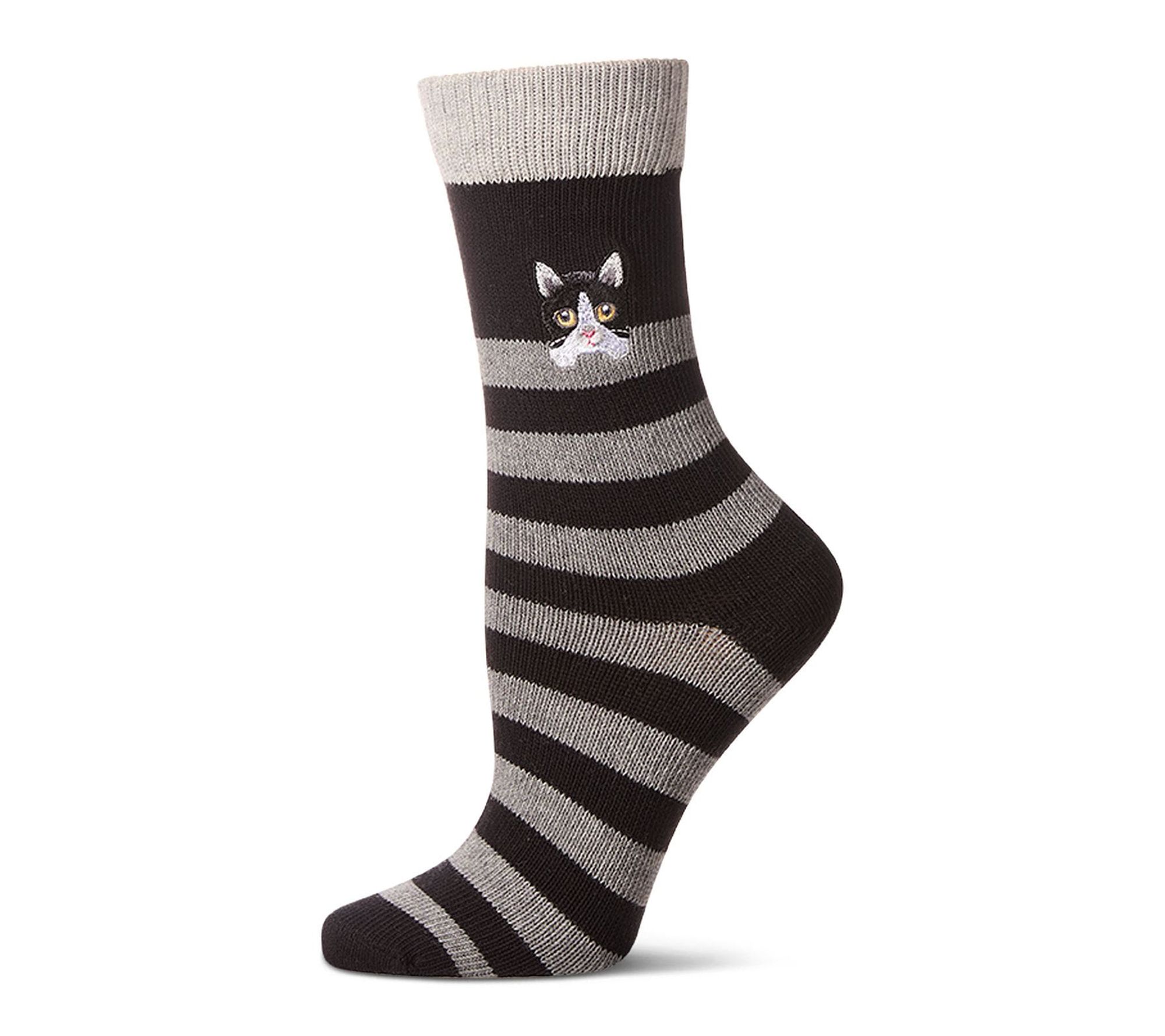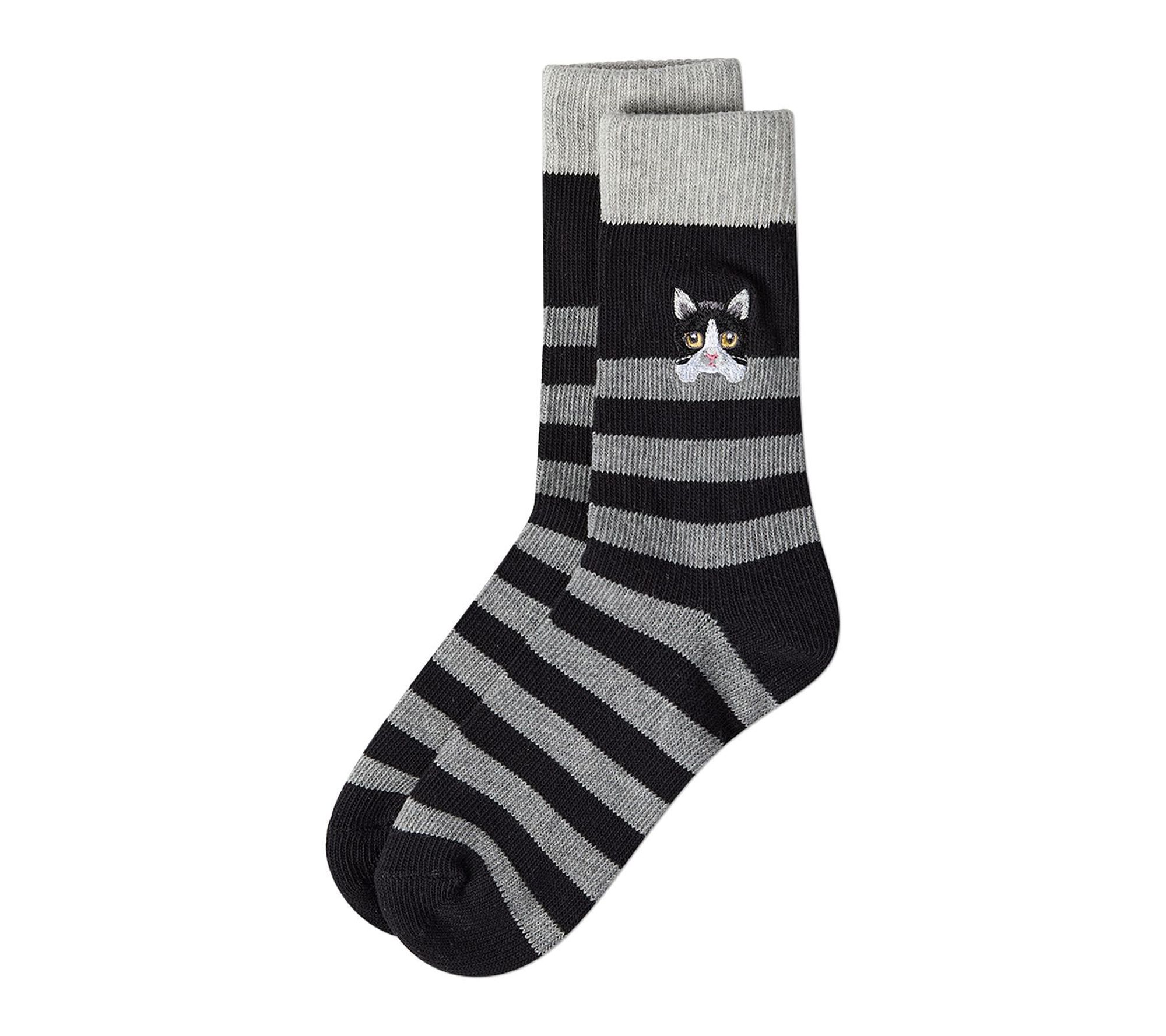 Playful embroidered crew socks are a delightful choice for expressing your love of animals -- whether you're lounging at home or heading out for errands. Crafted in a cotton-rich knit, these socks combine soothing softness and breathable comfort. Sporty knit-in stripes and quirky grumpy animal faces add lighthearted fun to your everyday style. From MeMoi.