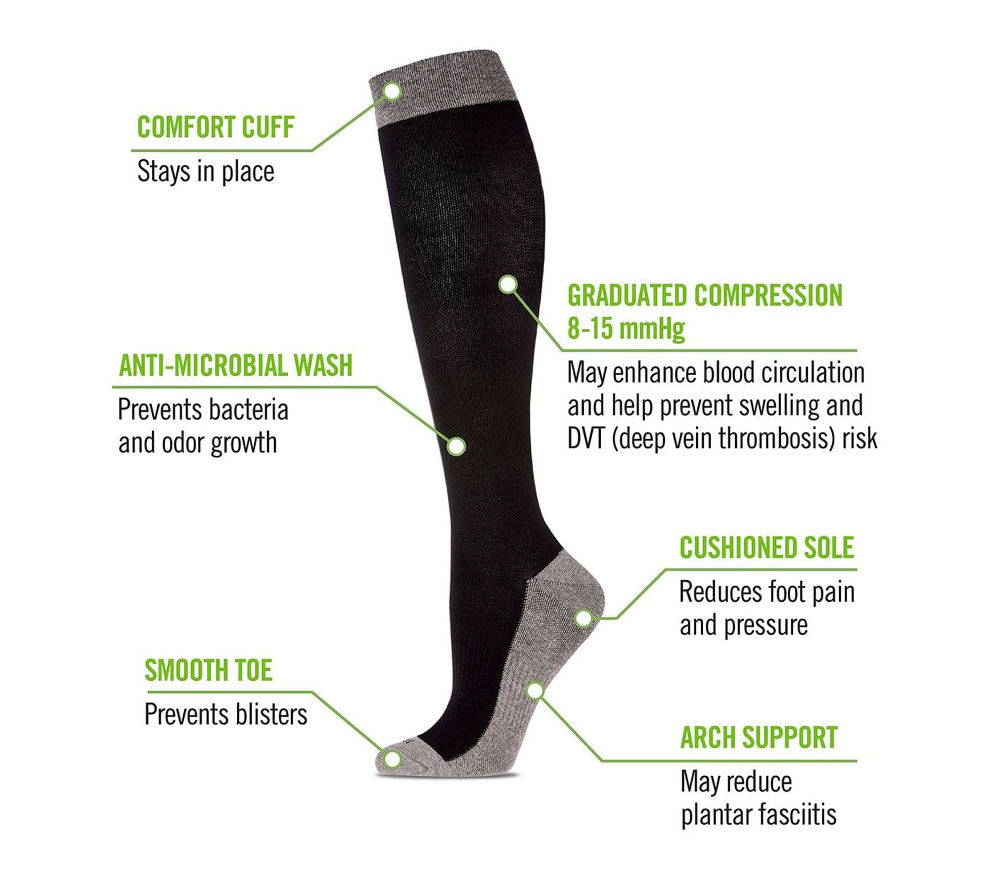 • Features: moderate graduated compression, two-tone contrast, comfort cuff, non-slip fit, smooth seamless toe, cushioned sole