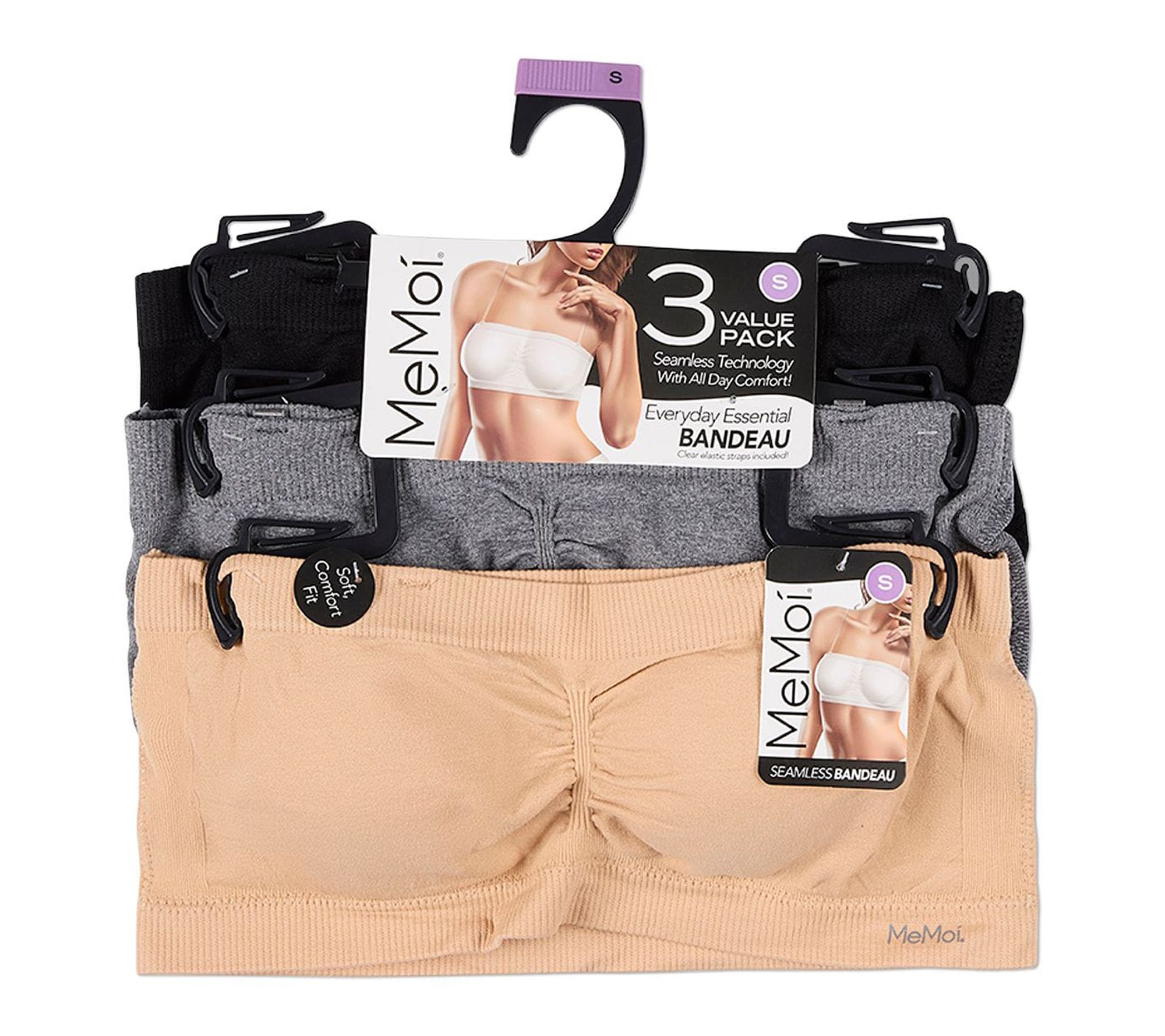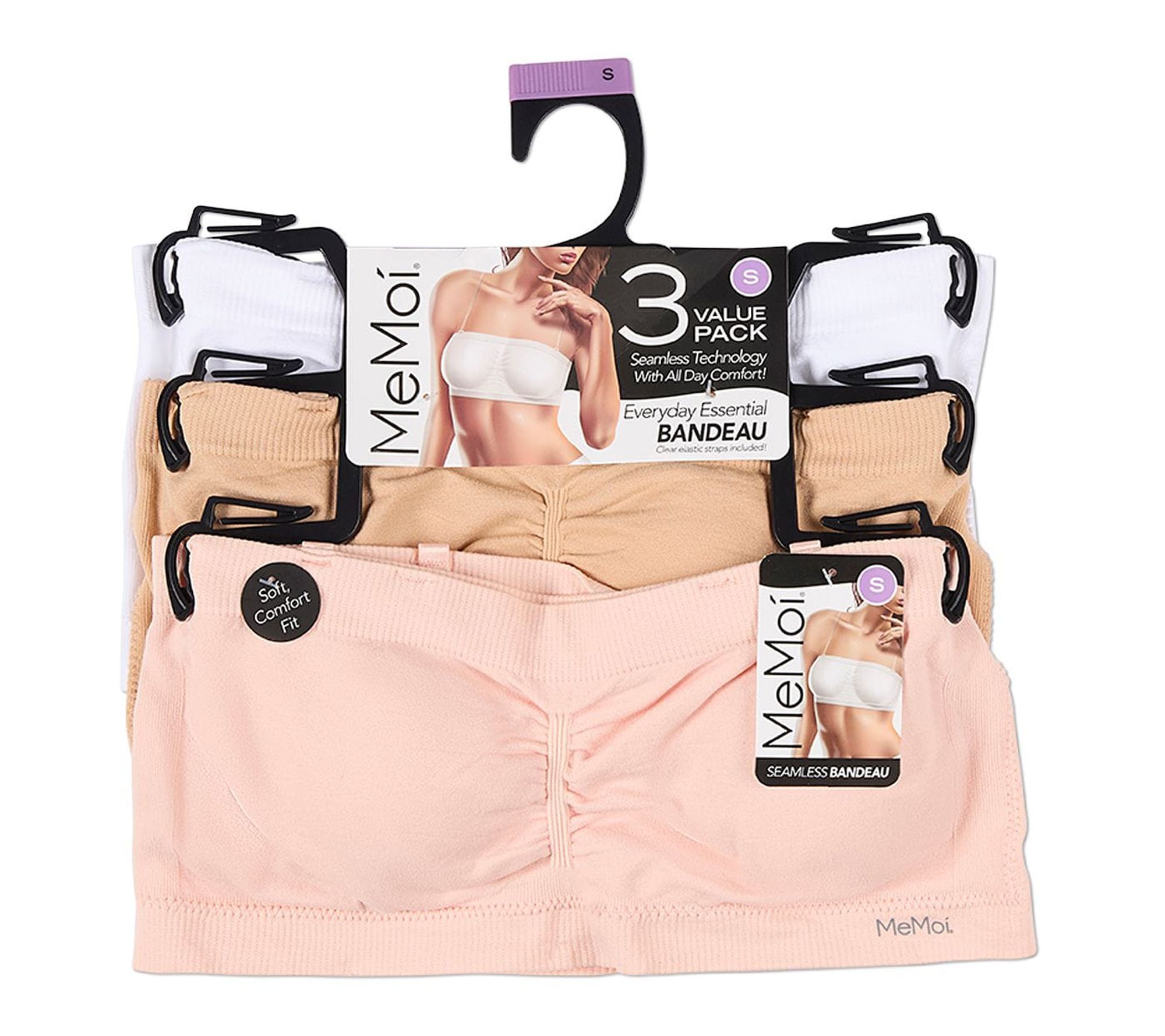 Whether you're pairing it with a sundress or your favorite off-the-shoulder top, this bandeau bra offers effortless comfort and confidence. Enjoy support with removable padding, clear elastic straps, and seam-free construction -- all in super-soft, tag-free fabric that helps deliver a smooth silhouette with four-way stretch. From MeMoi.