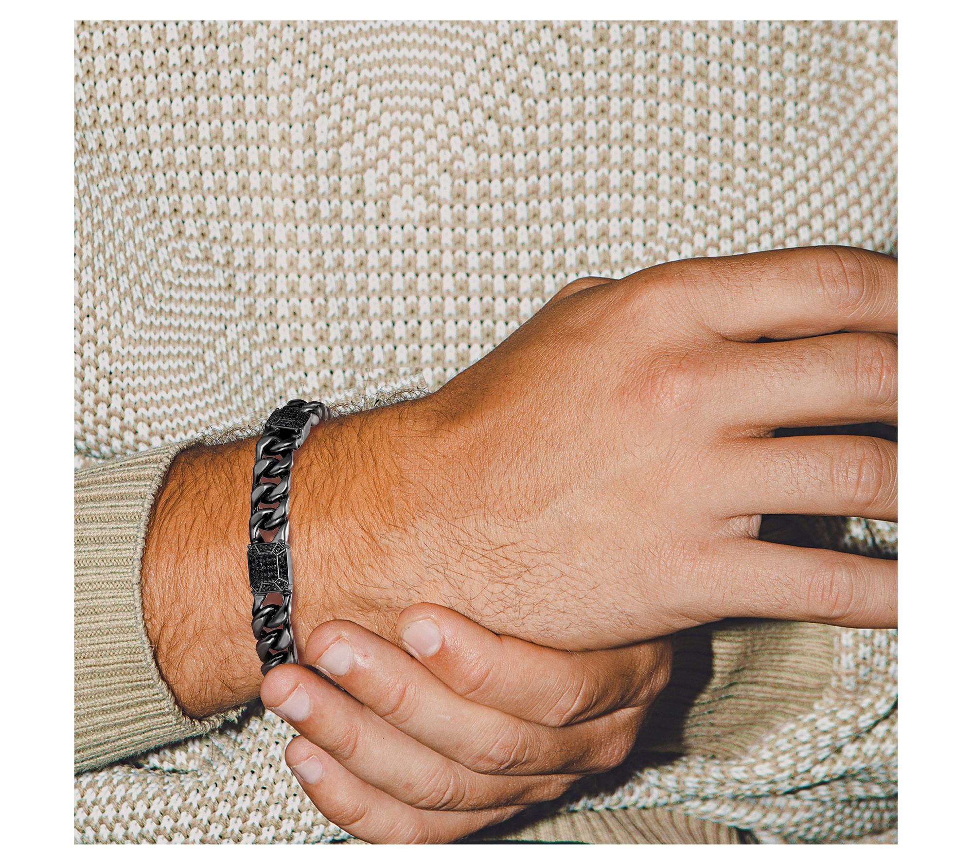 A bold curb link bracelet makes a strong statement day or night. Dark gunmetal over sterling silver gives a modern edge, while black sapphires catch just the right amount of attention with their subtle sheen. Ready to dress up your favorite button-down or elevate your casual look, this piece transitions smoothly from office hours to after-hours.