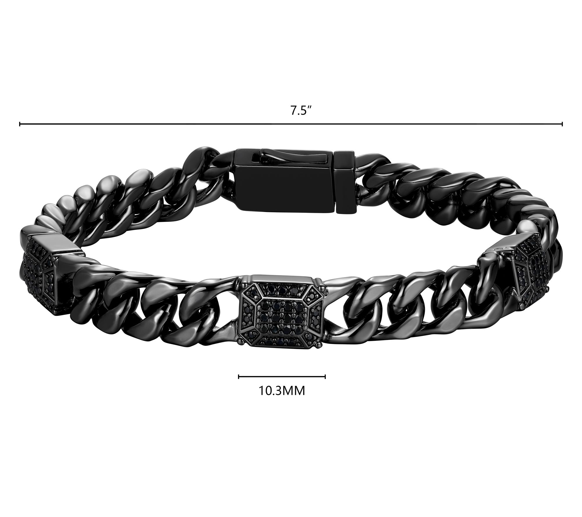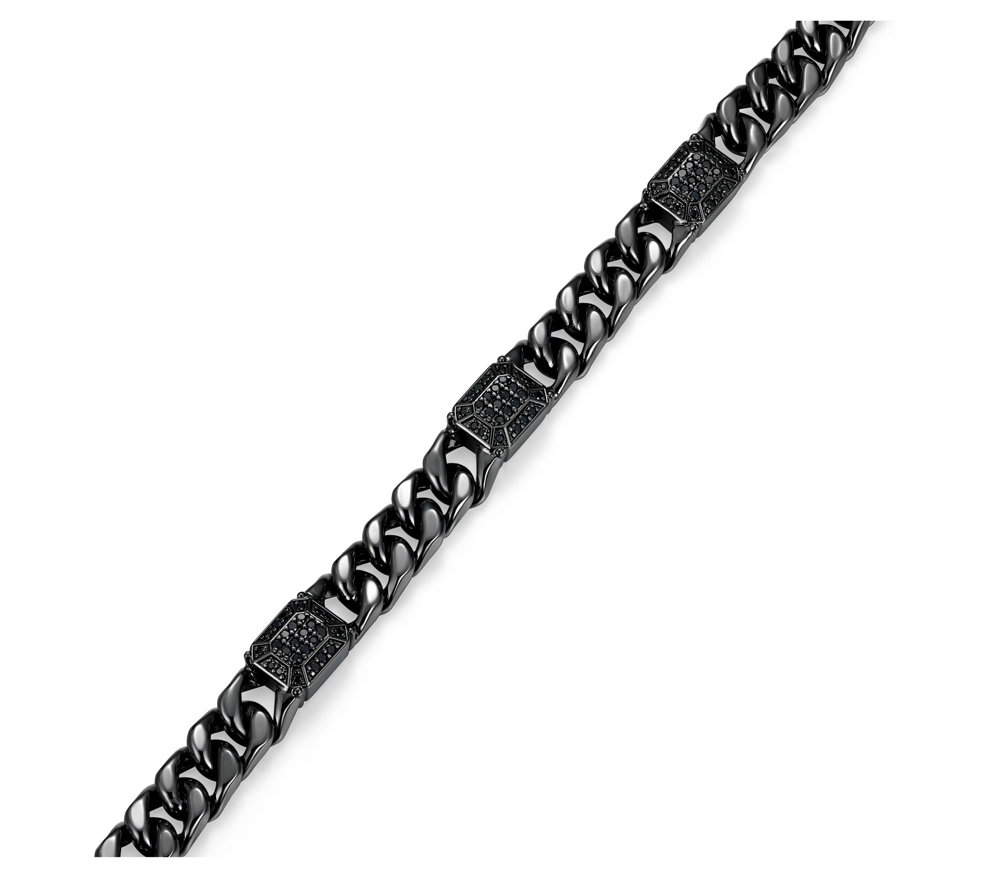 • Round-cut, black sapphire gemstones in pave settings; curb link design