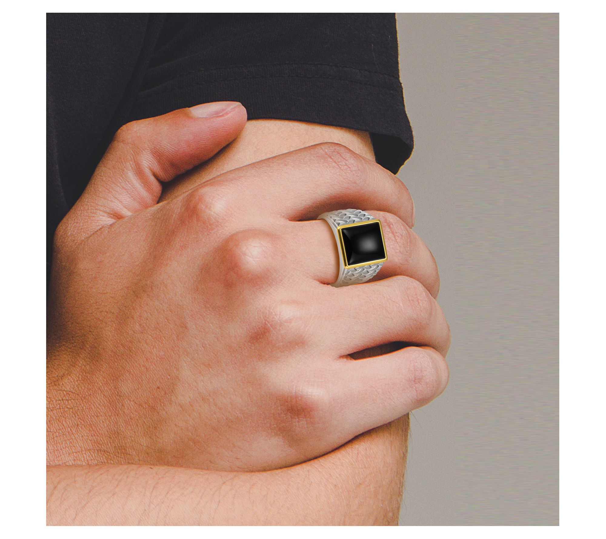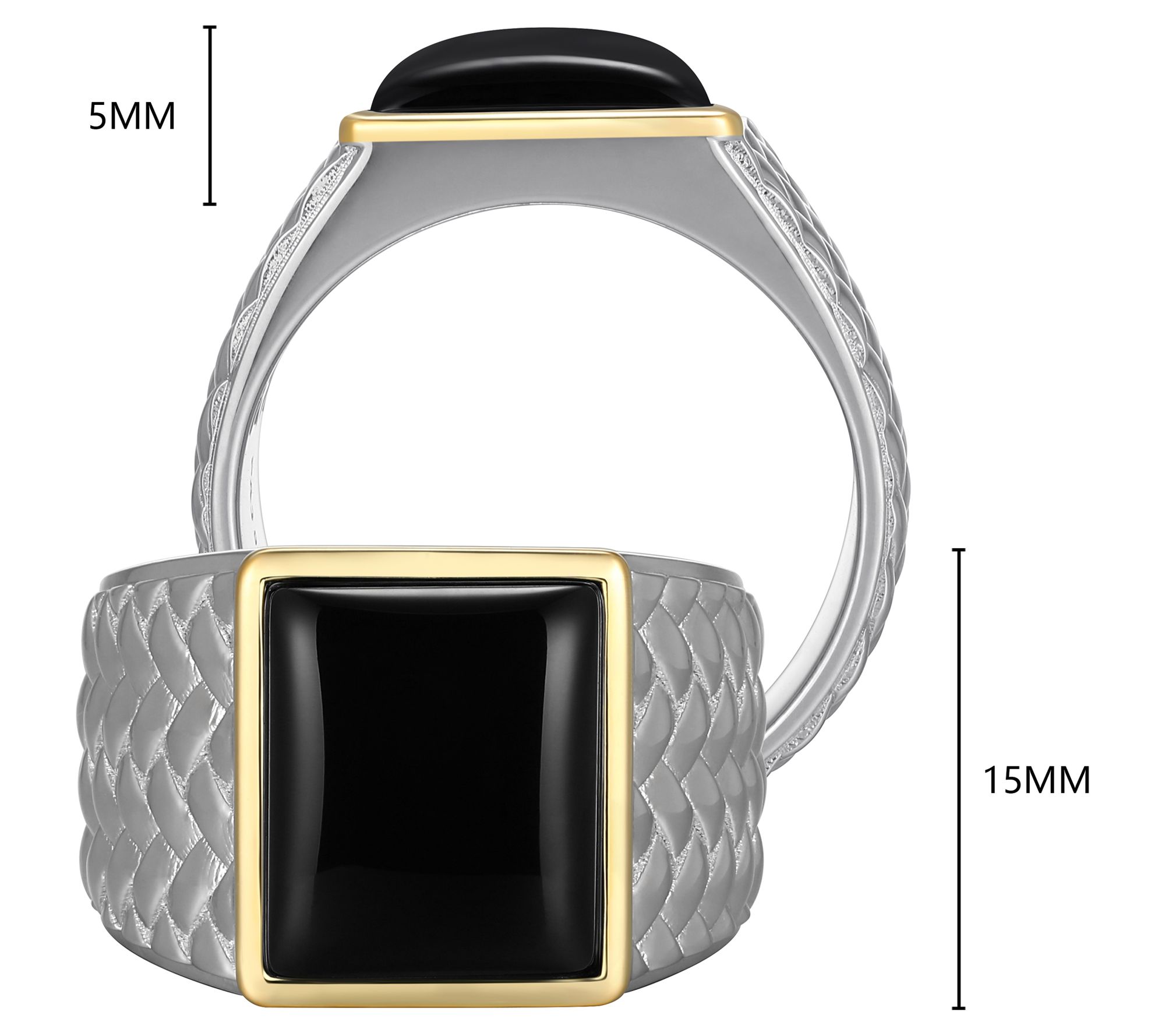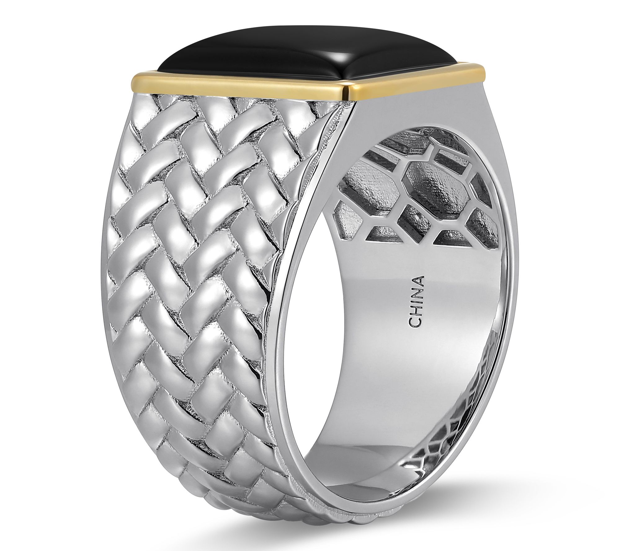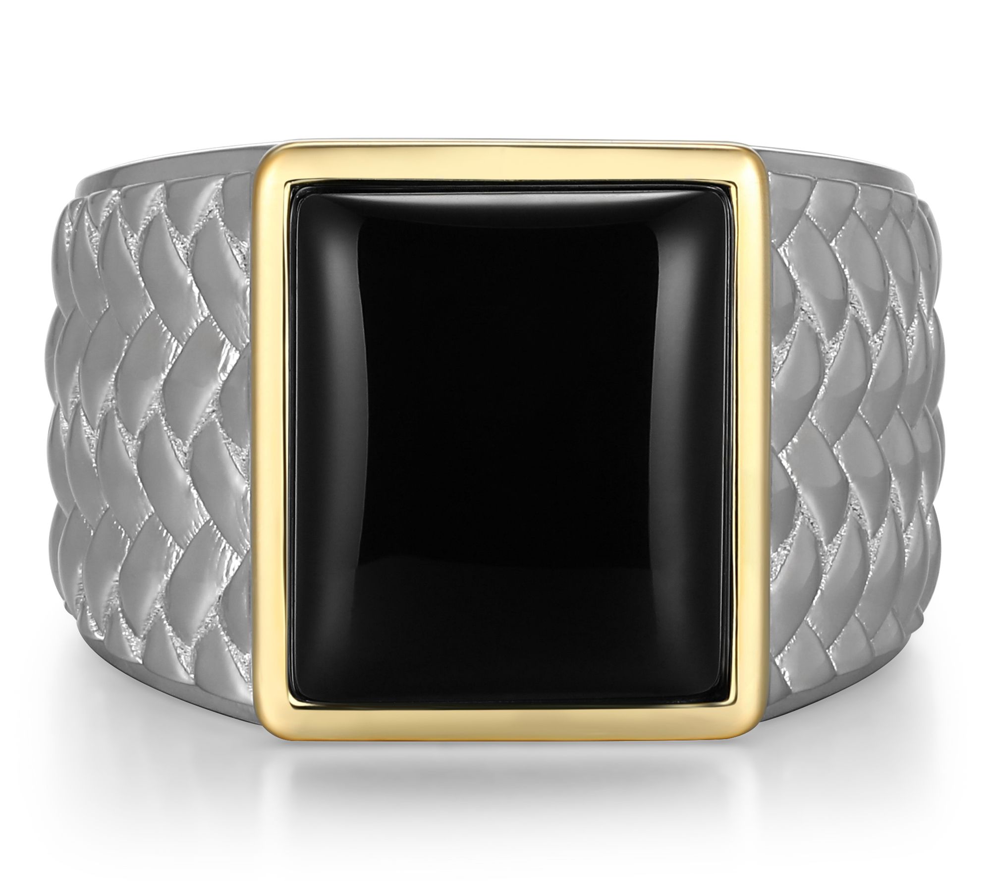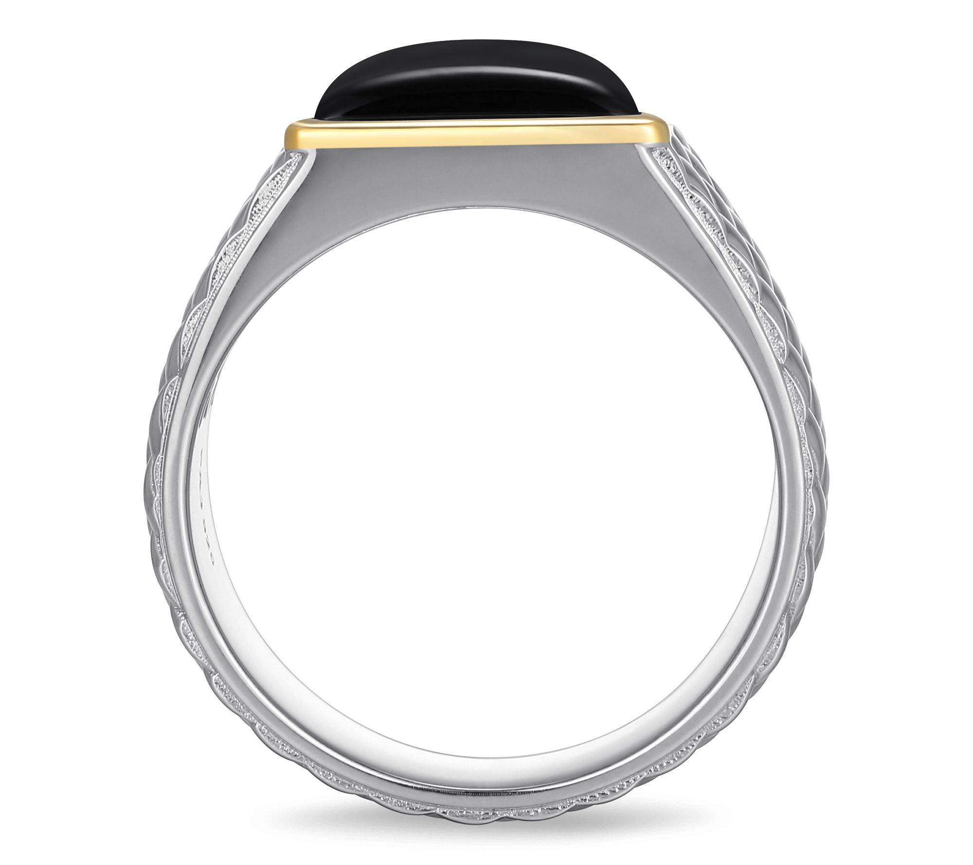 - Two-tone desig; baguette-cut black agate cabochon; 10K gold border; polished finish