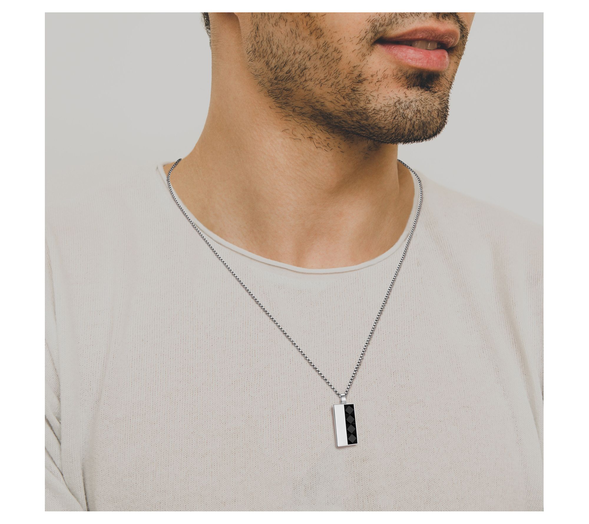 Elevate your style with this men's pendant necklace. Crafted from rhodium-plated sterling silver, the striking design features a black agate stone with a distinctive diamond pattern. The included 22" box chain adds a refined touch, making this pendant a versatile accessory for any occasion.