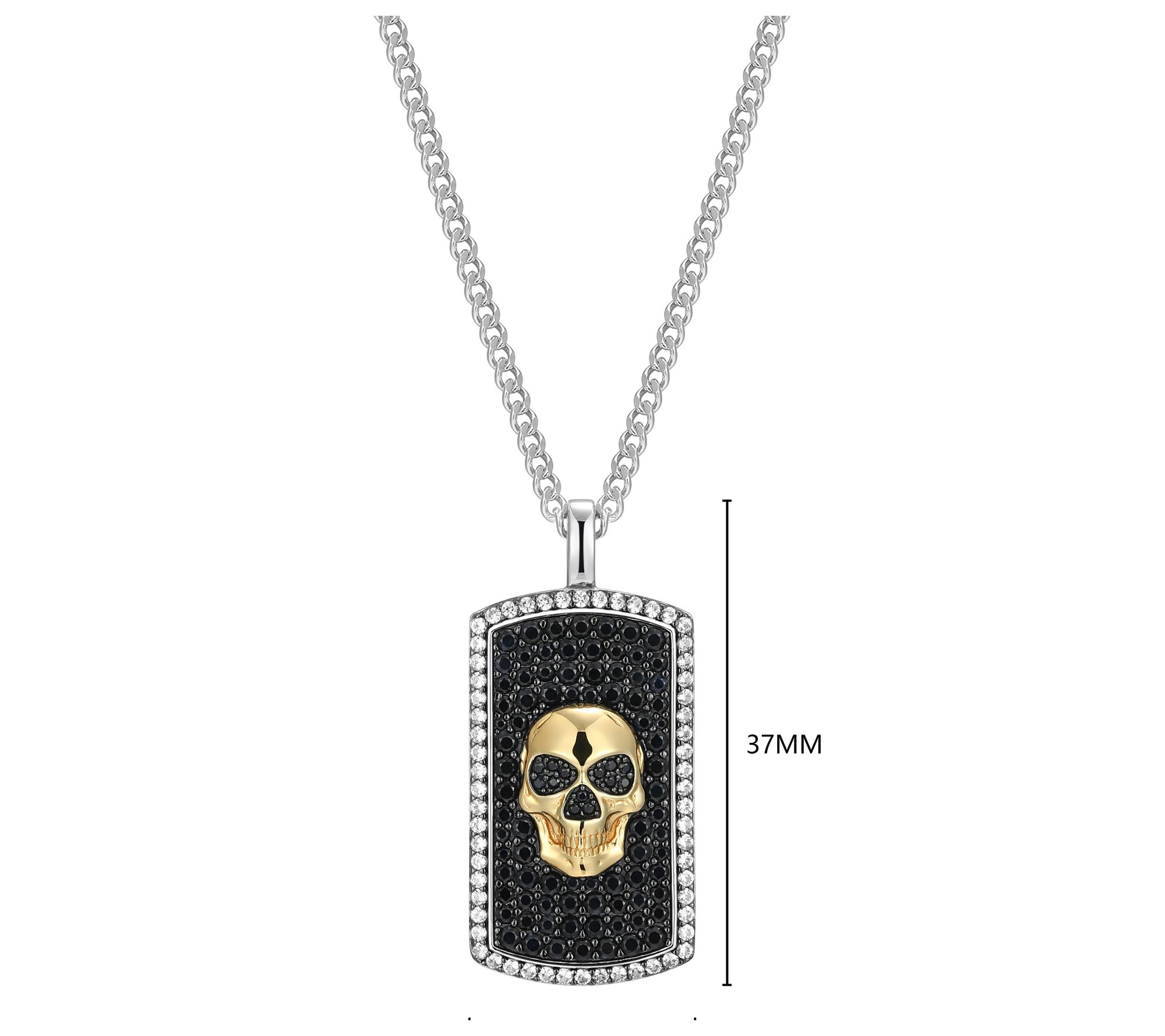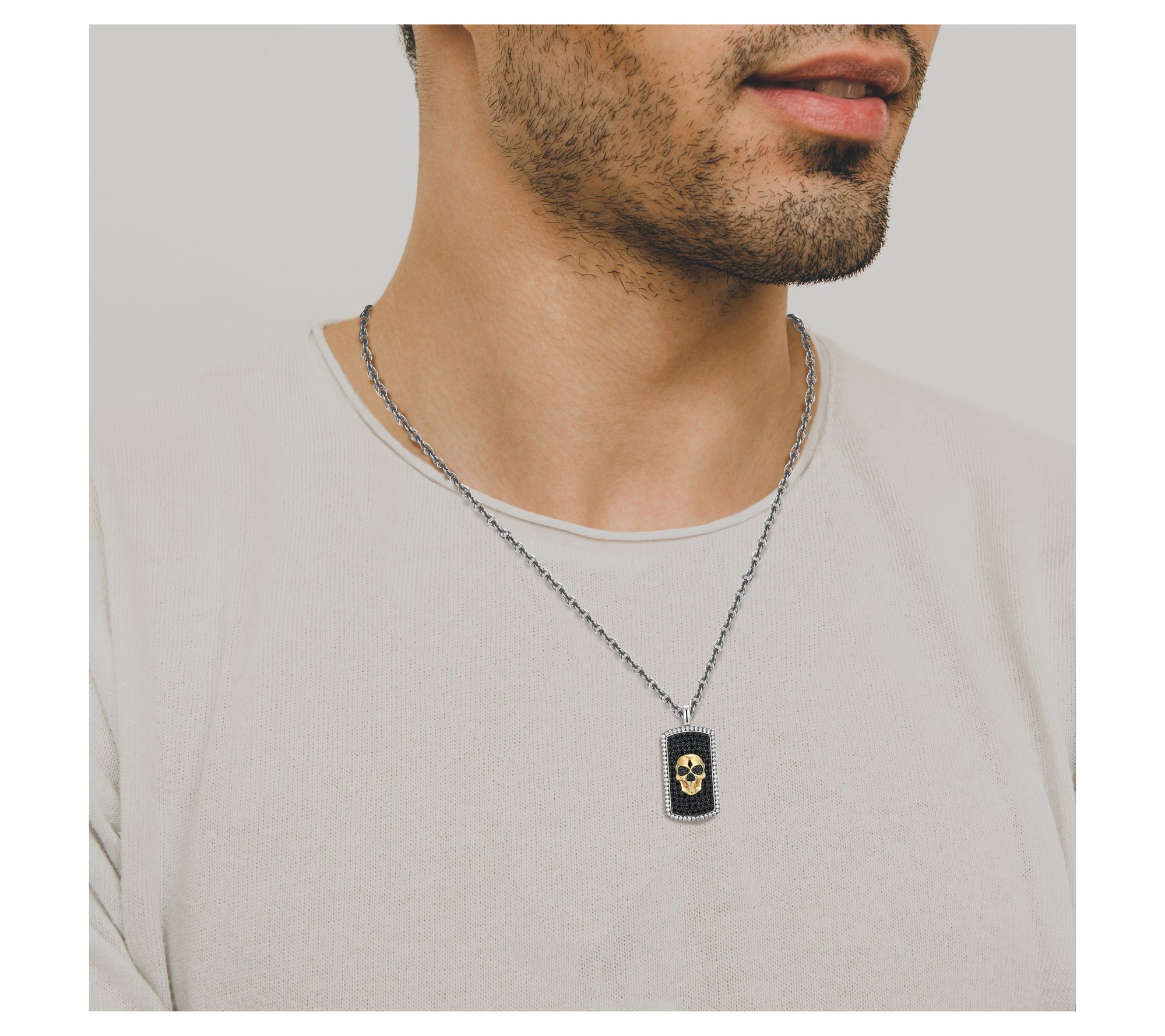 • Pave-set, round black sapphires and created white sapphires in a rectangle pendant; dimensional skull; tri-color design